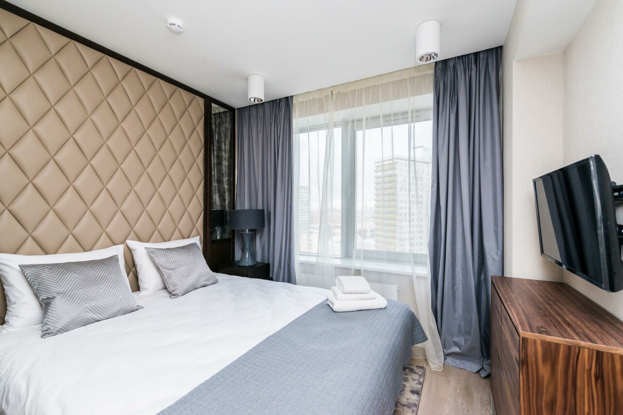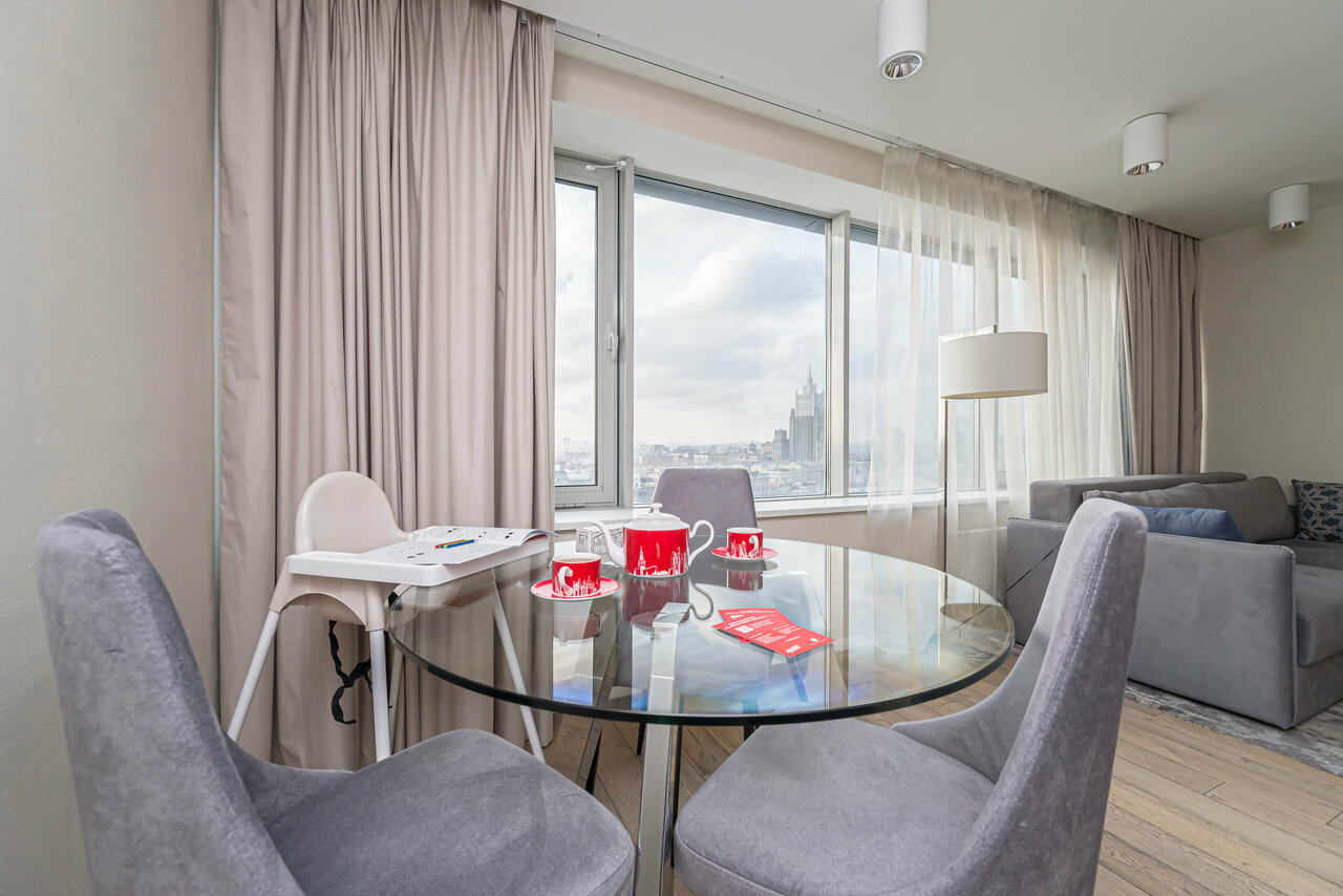 Отличные апартаменты. Свежий ремонт. Удобные кровати. Всё есть для комфортного проживания. Посуда, приборы. Бытовые приборы — доска, утюг, фен. 2 ТВ. Удачное место расположение. Рядом кафе и магазины. Весь центр в пеше доступности. Только положительные эмоции! Как бонус — шикарный вид из окна на Москву. Респект!