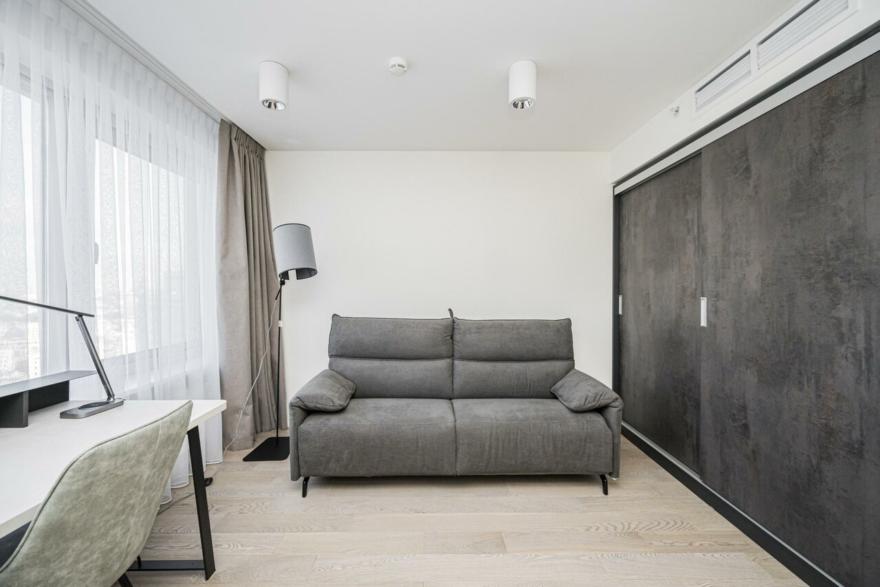 В наличии двуспальная кровать, дополнительный диван-кровать. Полностью оборудованная кухня, стиральная машина с сушкой, посудомоечная машина, встроенный питьевой фильтр. ТВ, вай-фай, рабочее место, душевая или ванная и шикарный вид с высокого этажа.