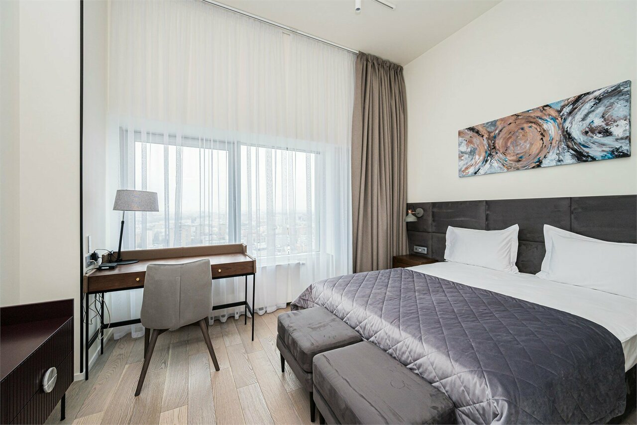 В апартаменте две спальни с двуспальными кроватями, кабинет со спальным местом. Просторная гостиная. Полностью оборудованная кухня, стиральная машина, посудомоечная машина. Балкон, два этажа, зона отдыха. 26 этаж.