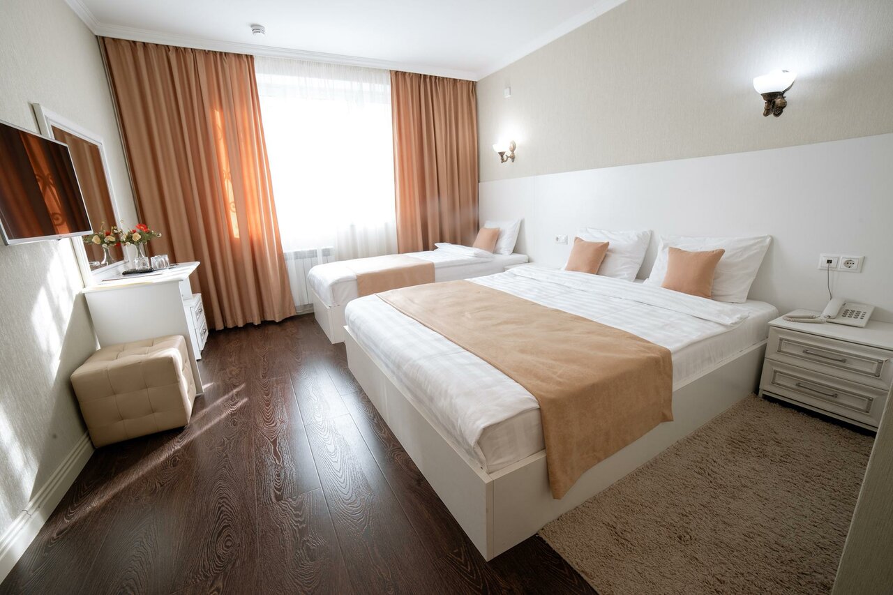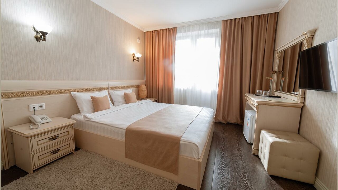 2-х местный номер класса стандарт. В номере кровати, шкаф для одежды, стулья, ТВ, холодильник, собственный санузел, кондиционер