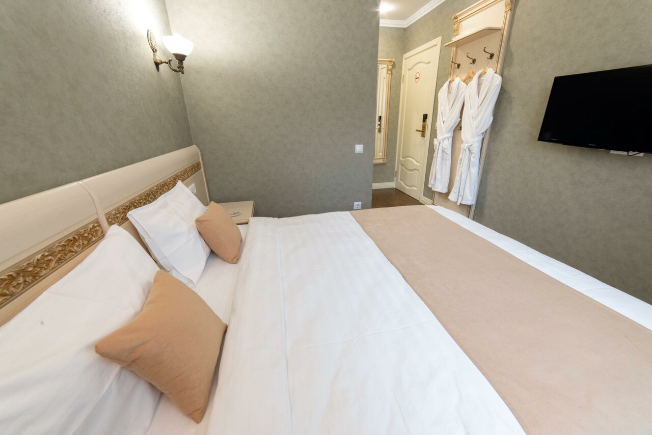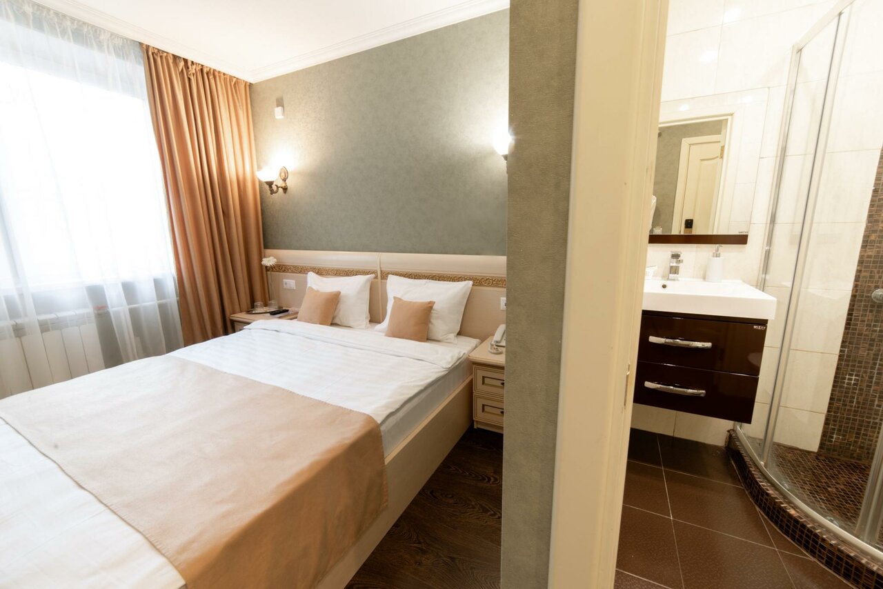 Приличный отель. Мы снимали номер люкс 2хкомнатный. В номере чистенько, одноразовые банные наборы есть, полотенца, халаты, санузел норм, в душевой кабинке дверца плохо открывается. В целом мне понравился номер, работа администратора, утром чай/кофе предложили. Как-то уютненько. И от метро не далеко