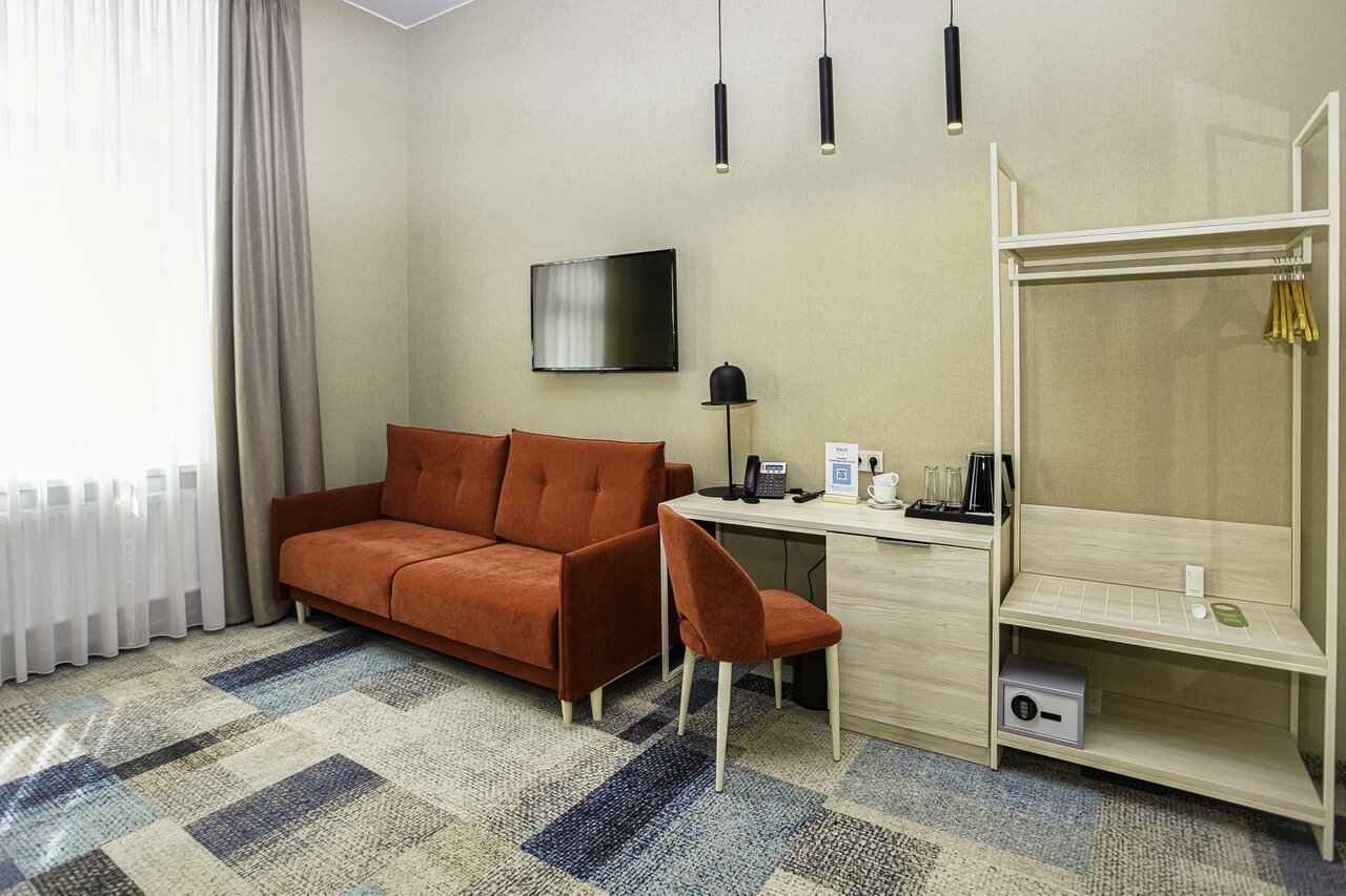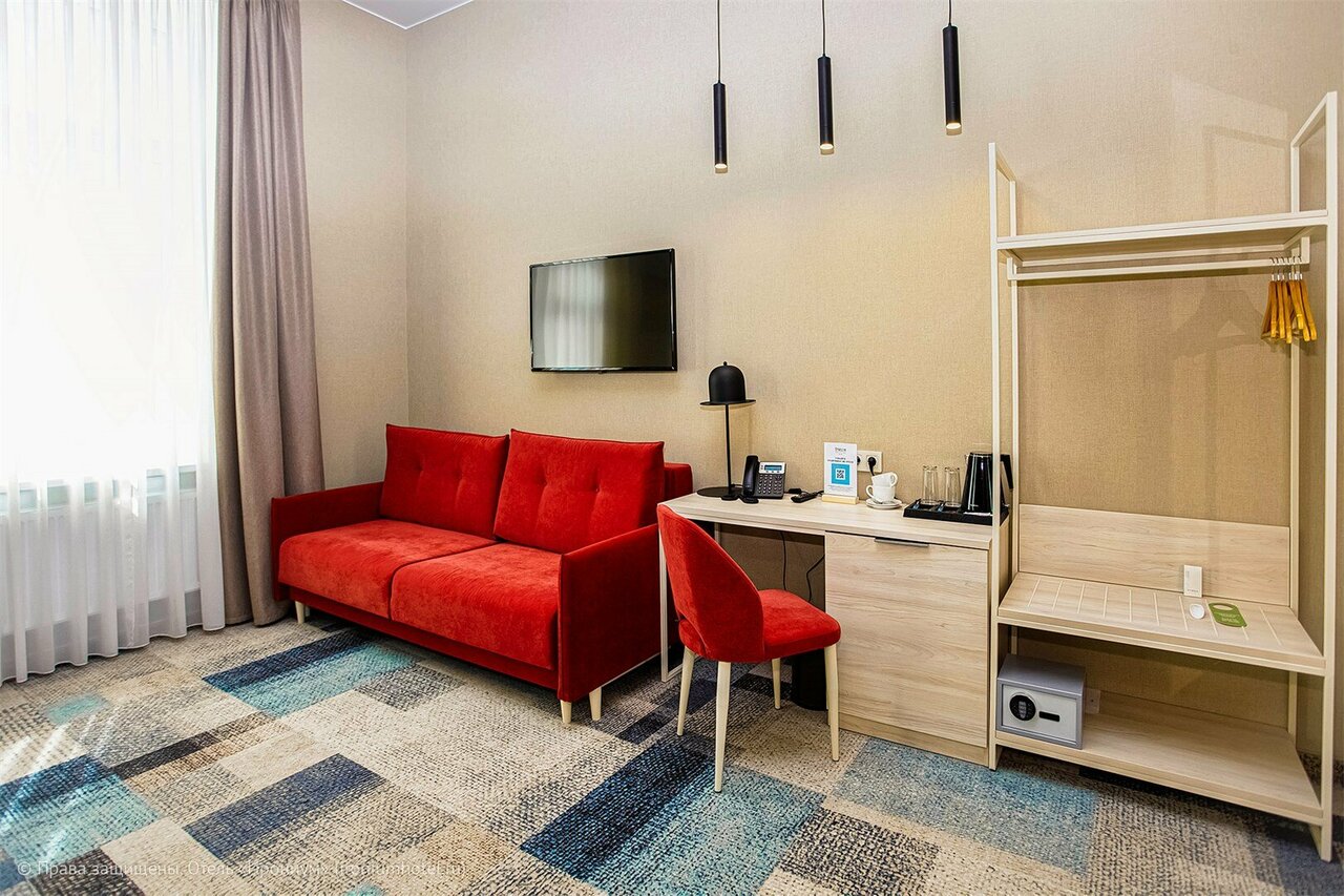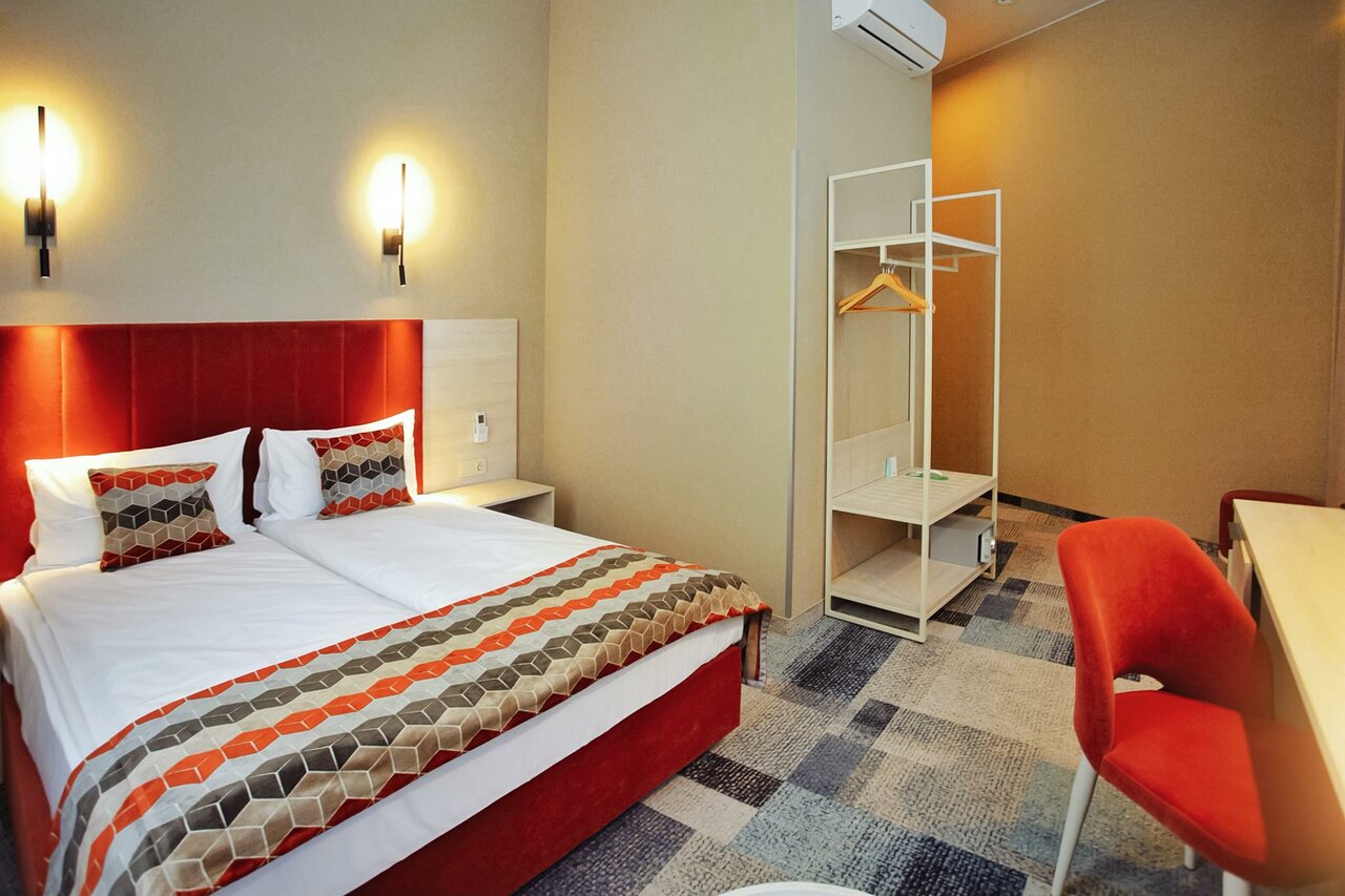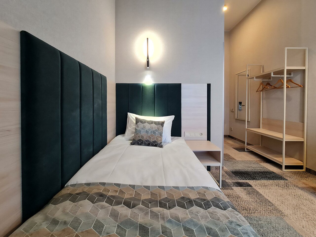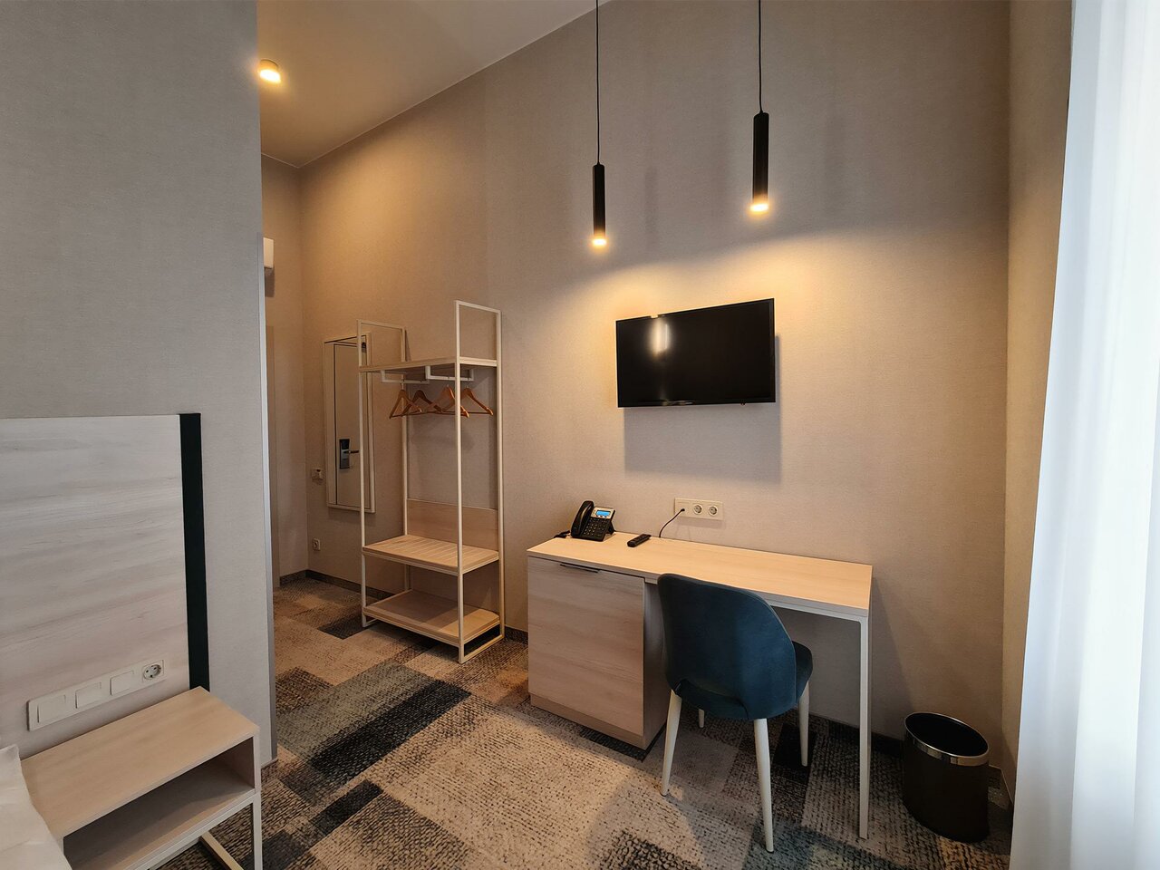 Тридцать комфортабельных номеров «Одноместный стандарт», оснащены всем необходимым для полноценного отдыха. На площади в 12 м2 расположены односпальная кровать, рабочий стол, вешалка-шкаф, большое зеркало и телевизор.