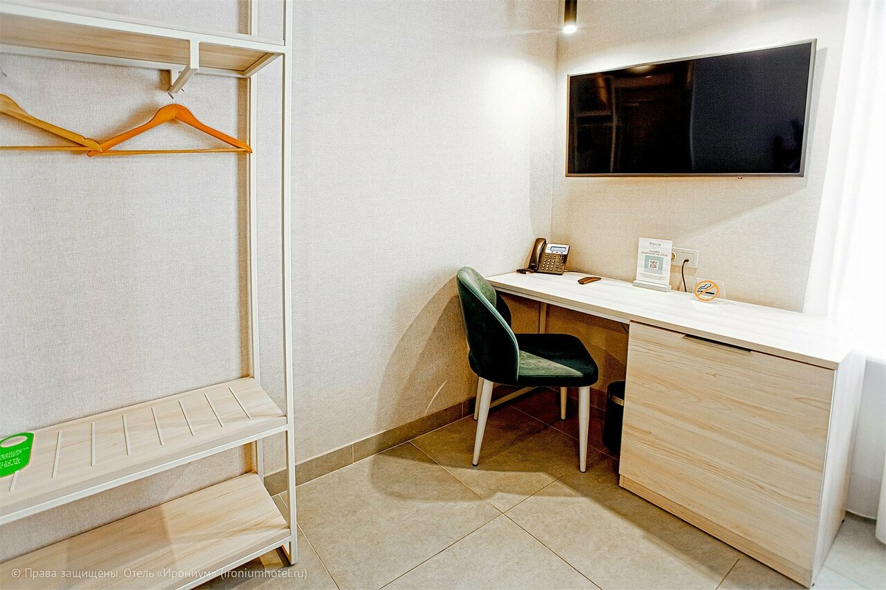 Гостиница «Ирониум» (Москва, Колпачный переулок, 4с4) — трёхзвёздочный дизайн-отель с круглосуточным заселением. Расположен вблизи парка, менее чем в 2 км от центра. В номерах: кондиционер, Wi-Fi, телевизор, холодильник, санузел, кнопка вызова персонала. Доступны услуги: камера хранения, прачечная, платное размещение с животными или детьми (кровати для 2–10 лет). В отеле есть лифт, общие зоны, автоматы с едой, возможность проведения мероприятий. Реконструкция проведена в 2022 году.