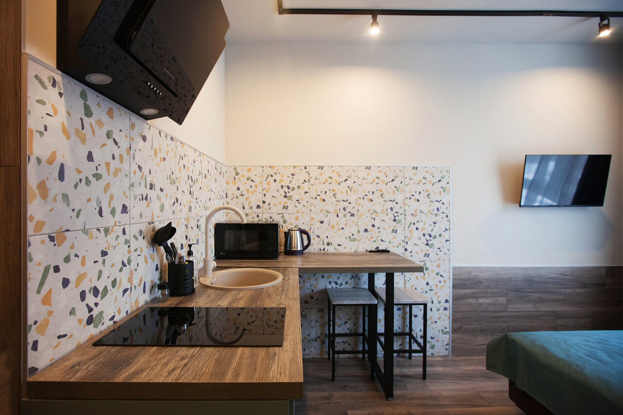 Чистая уютная студия.Искали рядом с клиникой,а вышло ещё и так,что рядом с кладбищем,где захоронена Матрона Москв. Претензий нет к арендодателю…Есть претензии к соседям,которые курят в соседних квартирах:окно на проветривание открыть нереально:как будто курят круглосуточно тебе под окна(((.Шумоизоляция никакая:через стенку чихнули:слышно( Ну ещё хотелось добавить,чтобы в номере хотя бы был Пакетик чая или ложка кофе В целом впечатление положительное.администратор Марина очень приветливая и вежливая.Звезду снимаю только из-за курения соседей