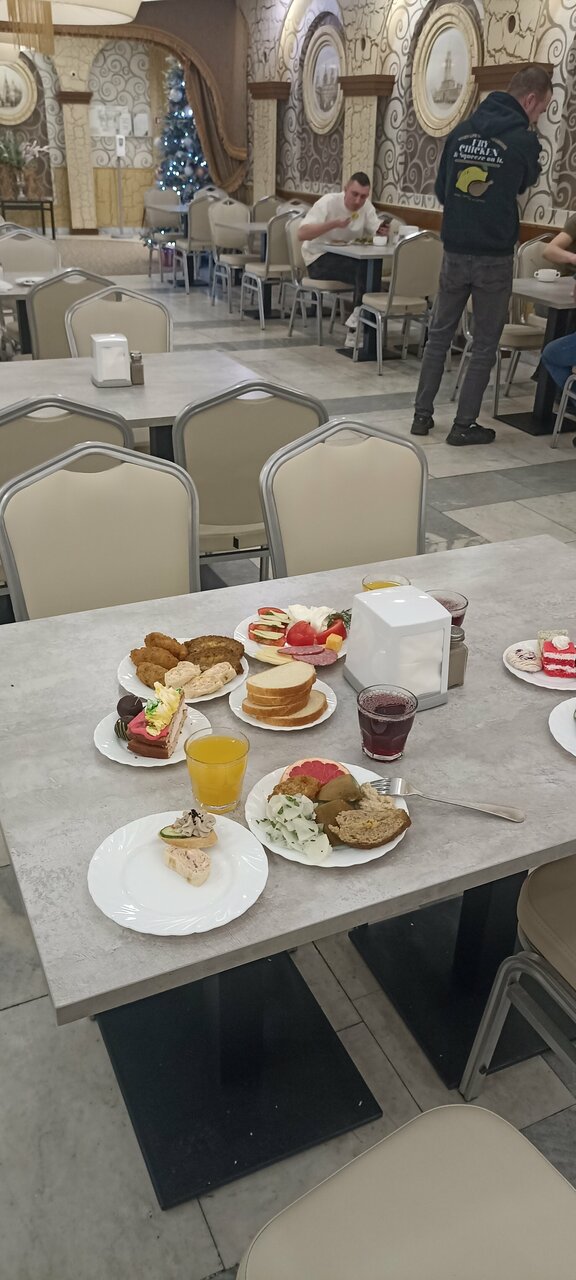 Завтрак на 5. Номер на 3. В номере чисто, но штора сдернута и край висит, фен не работает, минибар отсутствует