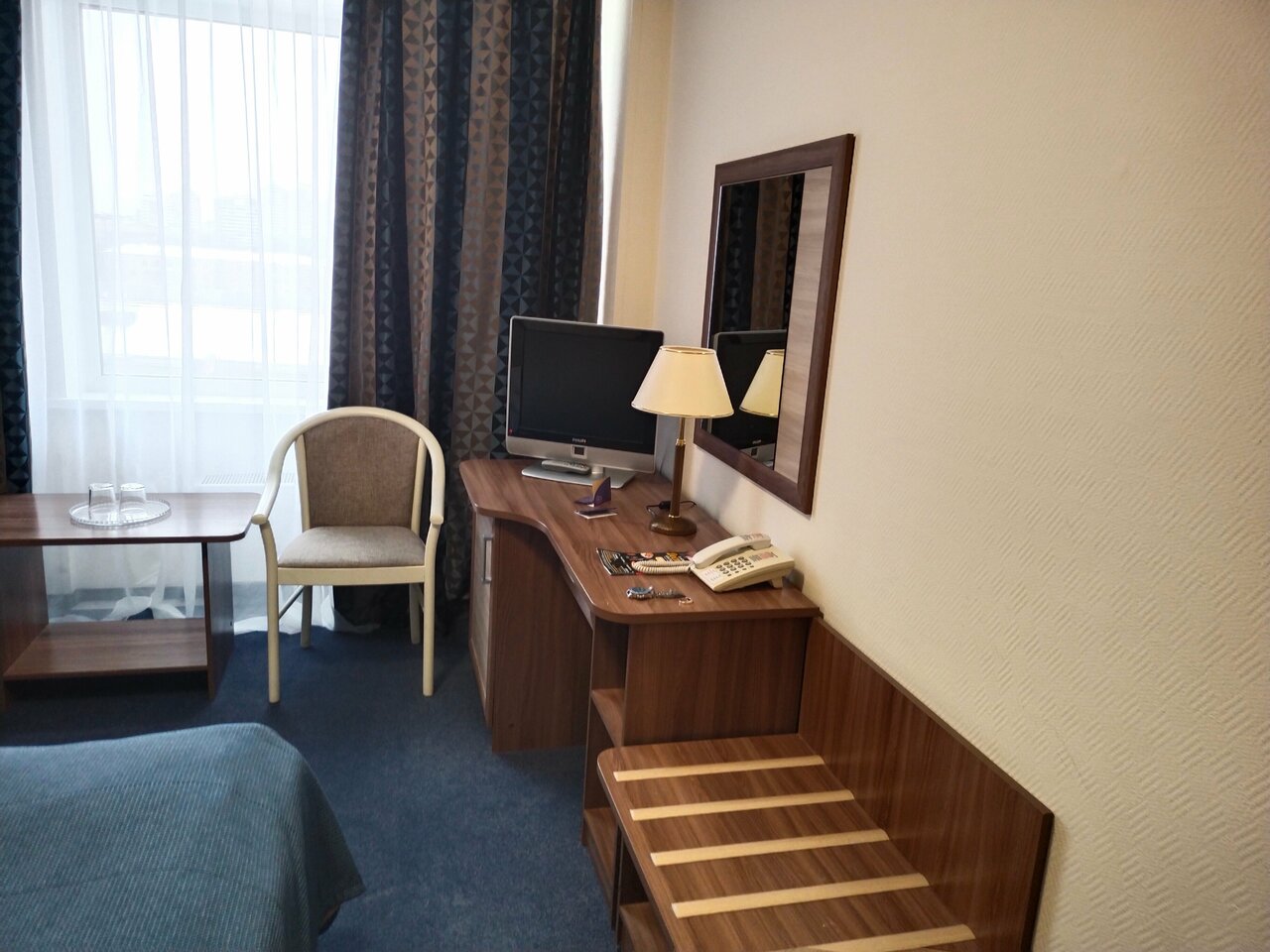 - Номер не соответствует заявленному классу (серые полотенца, простой интерьер).