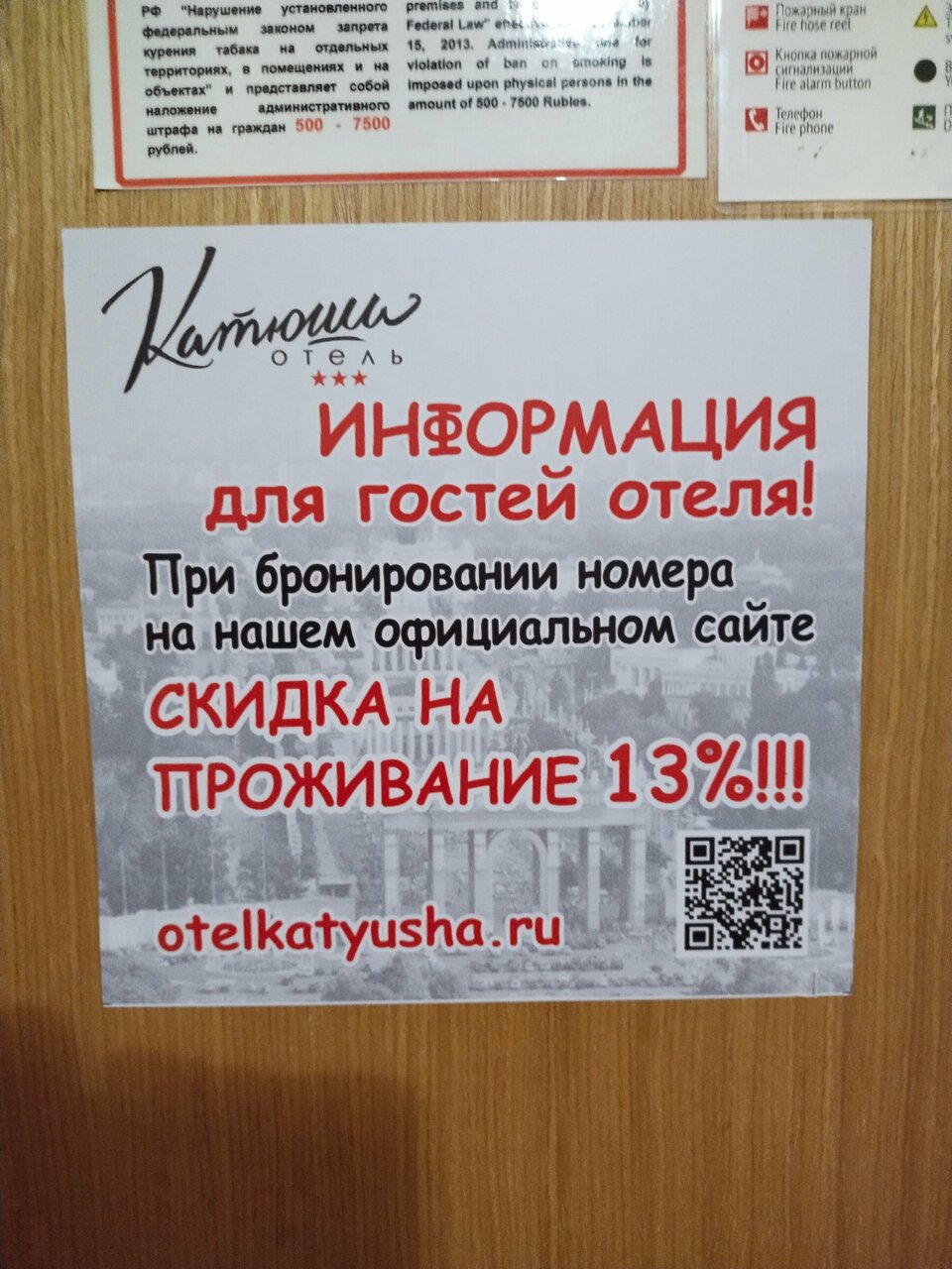 Останавливались проездом после долгого перелёта. Заселили очень быстро, хотя было очень поздно. Очень вежливо встретили и обслужили. Номер чистый, удобный,светлый , постель и полотенца белоснежные. Утром порадовал завтрак: учтено , что есть проживающие с детьми ( есть каша), можно и взрослому очень плотно позавтракать, а можно не отходить от диеты ( в наличии йогурты и лёгкая пища). Особенная атмосфера самого отеля оставила у нас только положительные впечатления. Цена и качество услуг соответствуют. Теперь если потребуется остановиться в Москве , то ‘ Катюша’ — это наш отель. Благодарю весь персонал и владельцев за отличный сервис.