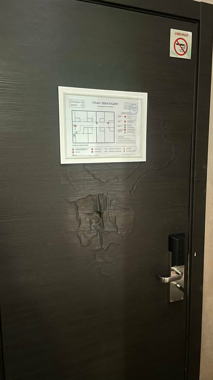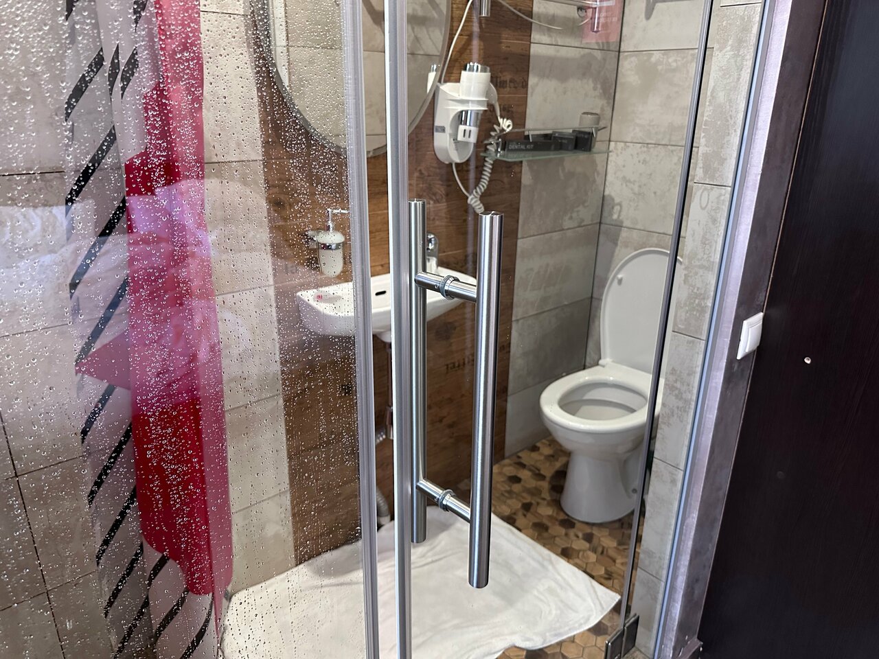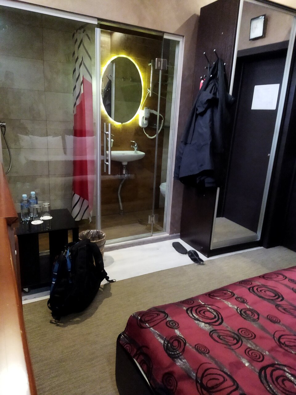 Заехали и я в шоке. В неприятном. В номере очень темно, во входной двери дырища, будто кто-то головой в неё бился, на раковине трещина. Замка на двери в уборной нет. Наверное, это из рассчета, что вы заселяетесь с человеком, перед которым можно и вообще без двери справлять нужду. Бонусом душевая кабинка из поколения первых кабинок пришедших в Россию. Если сесть на правый нижний угол матраса на кровати, то верх матраса поднимается. Из плюсов – чисто.