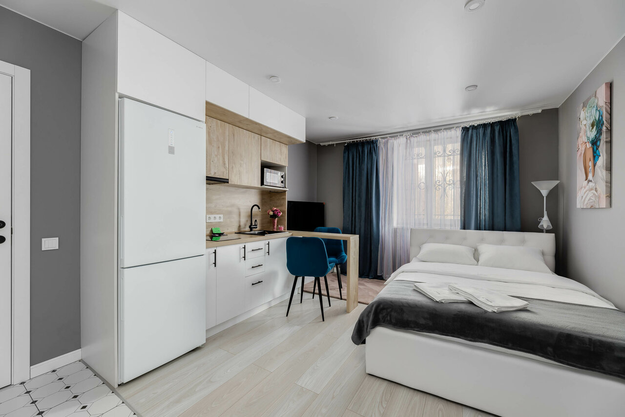 Очень уютные апартаменты, стильное оформление, в номере чисто, не слышно соседей, есть все удобства. Кровать удобная, большая. Есть ютюг и гладилка, можно погладить вещи. Душевая ‘на пятерку’ — всё компактно, но уютно. Идеально для командировок, для романтических встреч, для работы с ноутбуком, а также для уютного ночлега. Служба поддержки всегда на связи и помогает с вопросами.