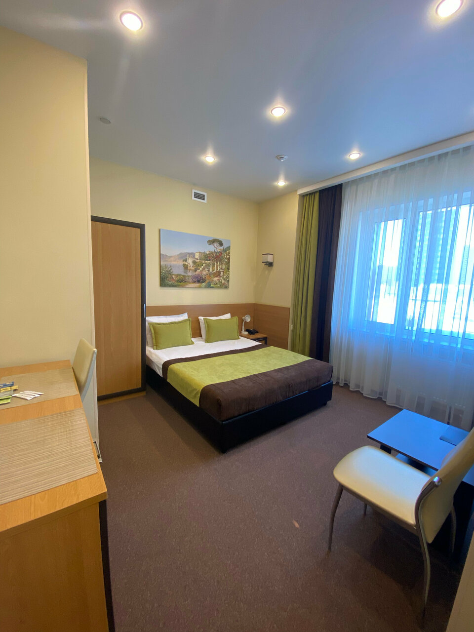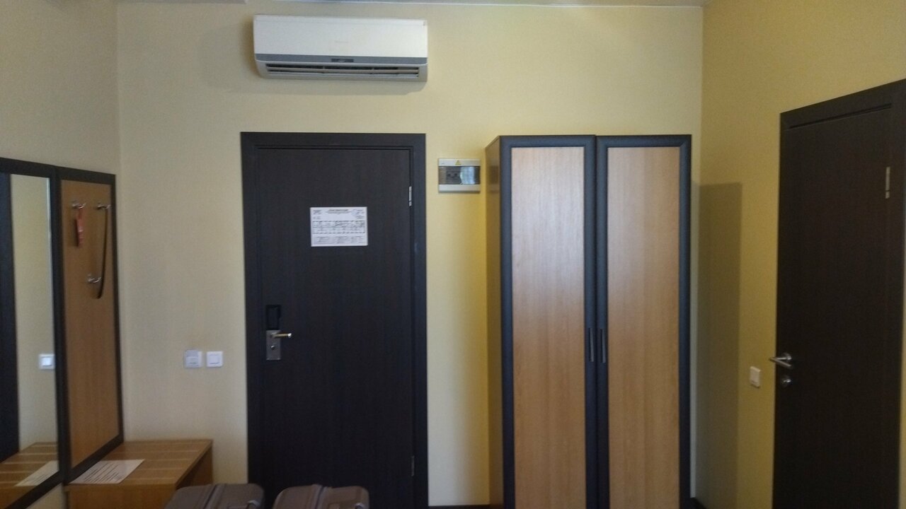 В принципе то неплохой отель для Москвы в среднем недорогом классе. Хороший холл и коридоры, не воняет. В номере атмосфера тоже хорошая, понравилось. Есть чайник, кружки, холодильник. В туалетной комнате/ванной лежат мыло и шампуни. Единственное не понравилось — это не очень чистая душевая кабина с плесенью и ободранными аксессуарами в ней. Располагается в 6 минутах пешком от метро Аэропорт. В этом же здании есть Пятерочка, шаурма и в принципе какой-то рынок.