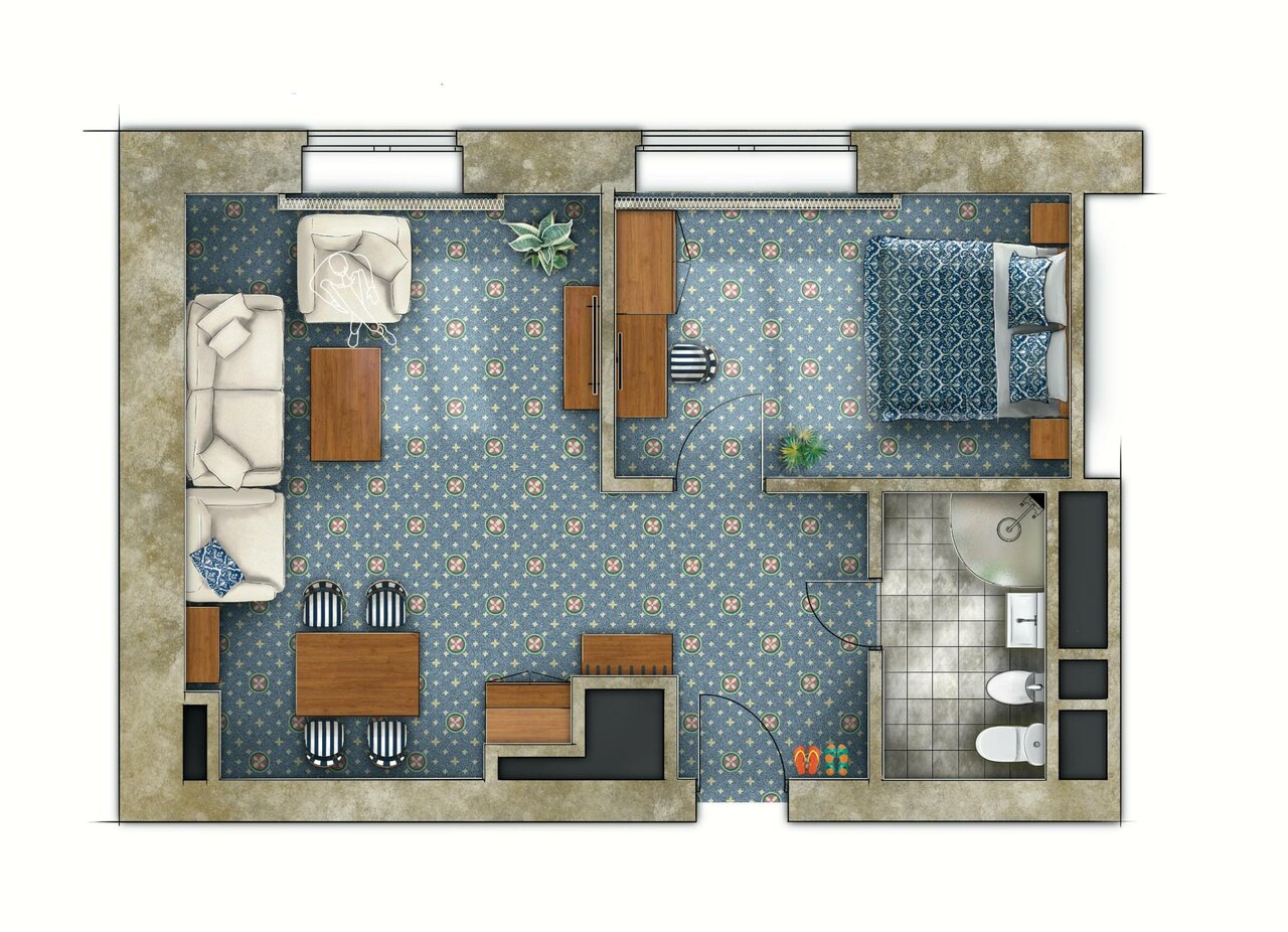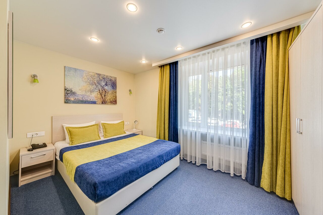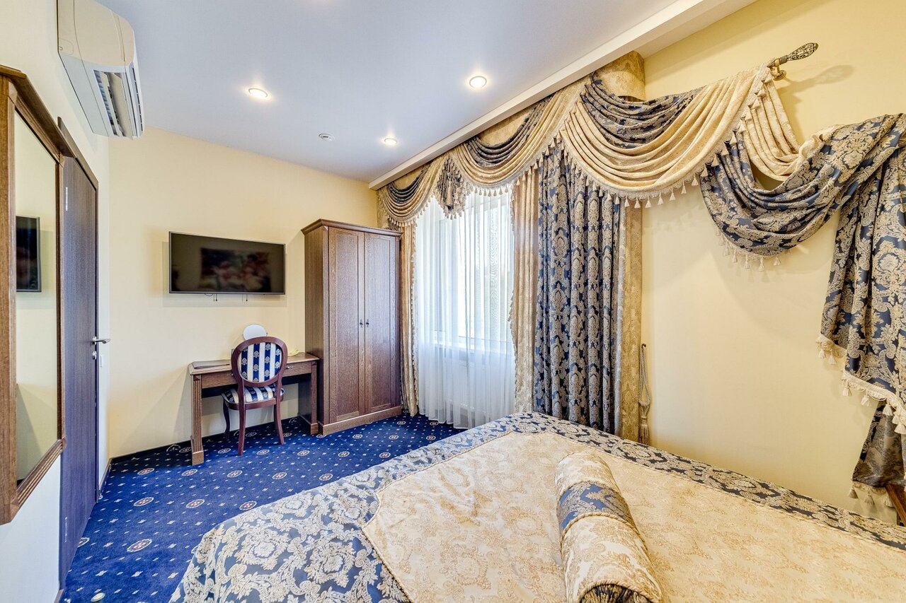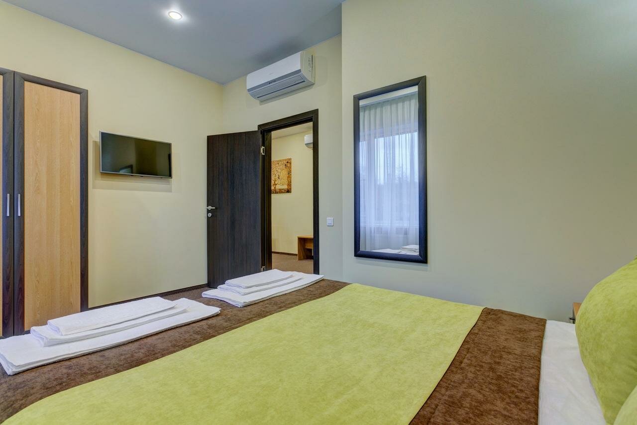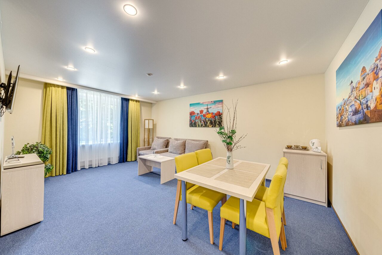 Комфортабельный двухкомнатный номер (спальня и зона для работы), два телевизора. Возможность комфортного размещения до четырёх человек.