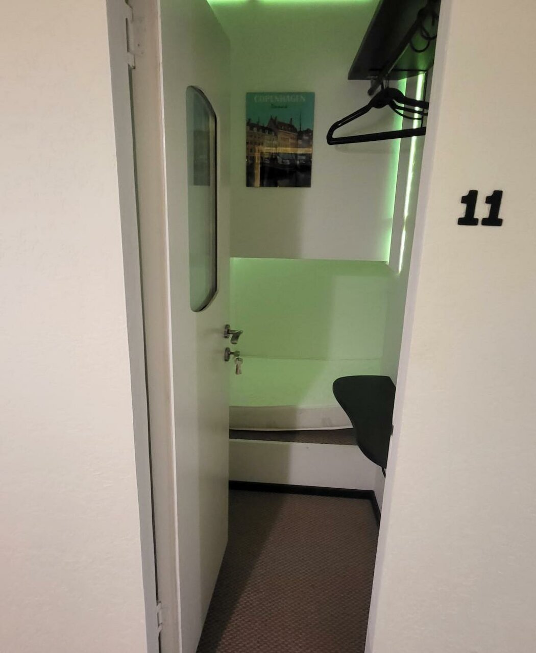 Номера капсульного типа с общим туалетом и душем, оснащены Wi-Fi, холодильником, чайником, микроволновкой и посудой. Есть общая кухня, но питание не включено. Удобства: фен, утюг, тапочки, консьерж-сервис.
