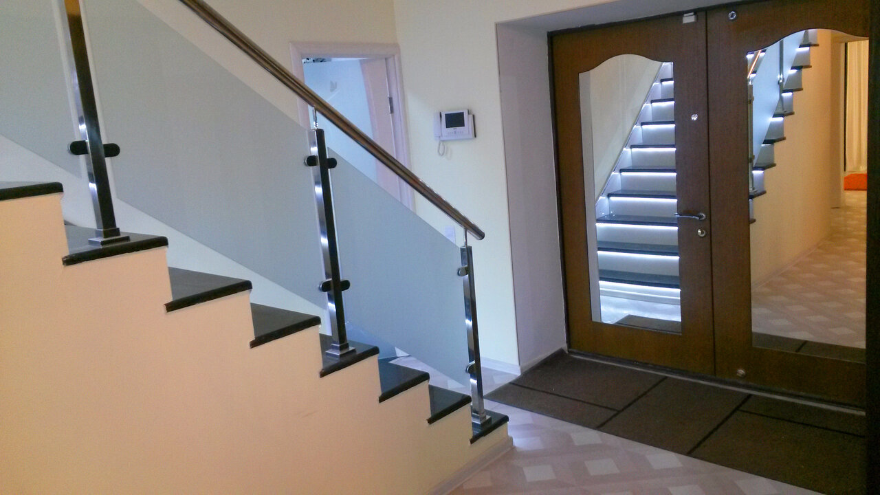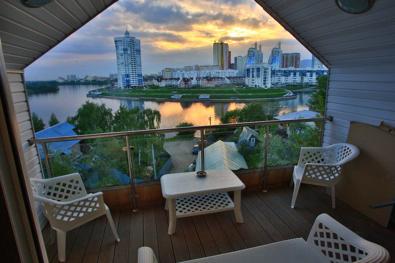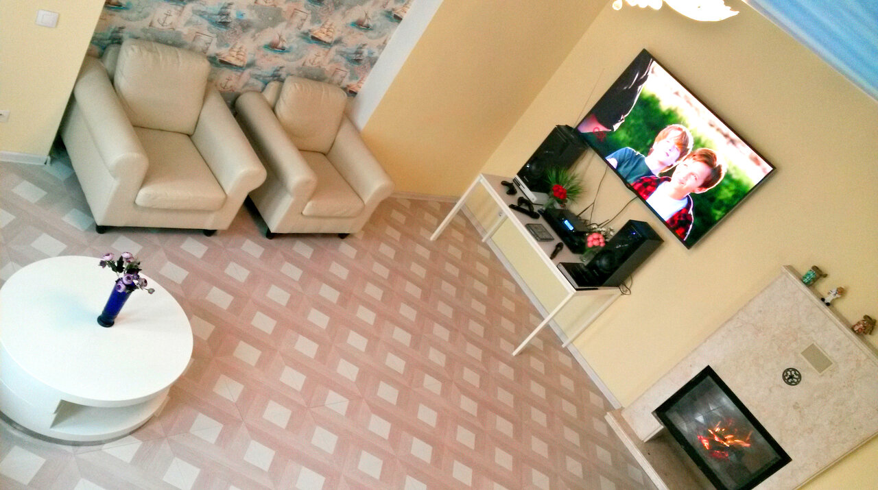 - Очень много места, идеально для больших компаний.; Отличный ремонт, чисто и красиво.; Вид с балкона на 3 этаже.; Парковочные места.; Отличное месторасположение.