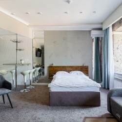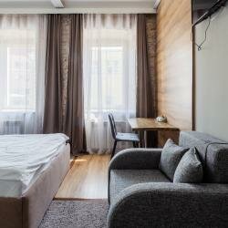 Уютный красивый номер повышенной комфортности: двуспальная кровать, телевизор, шкаф, столик, пуфики. В ванной комнате душ, туалет, тапочки, полотенца и средства личной гигиены.