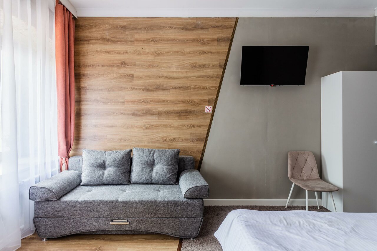 Семейный номер Комфорт одна двуспальная кровать и двухместный диван, телевизор, рабочая зона, кондиционер, шторы блэкаут, ванная комната, полотенца, тапочки, средства личной гигиены