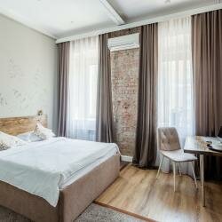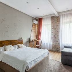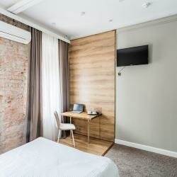 Уютный красивый номер повышенной комфортности с одной двуспальной кроватью, телевизор, столик, пуфики, собственная ванная комната, окна во двор. В ванной комнате душ, туалет, тапочки, полотенца и средства личной гигиены.