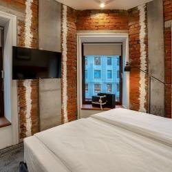 При входе в гостиницу вас встречает запах еды. На этаже с гостиницей находится бар. Если вы берете номер без окна, дважды подумайте, т.к. он соседствует с ночным клубом, который работает до 5 утра. Поспать у вас, врятли, получится. Мы решили переселиться в номер с окном. Сам номер, в целом, неплохой, есть сейф, двуспальная кровать с хорошим матрасом. Хочу отметить, что вентиляция в номере была очень мощной. Серьезно, прям, мощной, настолько, что нос мёрзнет пока пытаешься уснуть. Хочется отметить хороший, добрый и отзывчивый персонал гостиницы. Они правда стараются сделать пребывание максимально комфортным. Итог: в целом, переночевать пойдёт, но придется поступиться комфортом. Местоположение очень удобное, 5 мин до метро ‘Театральная’.