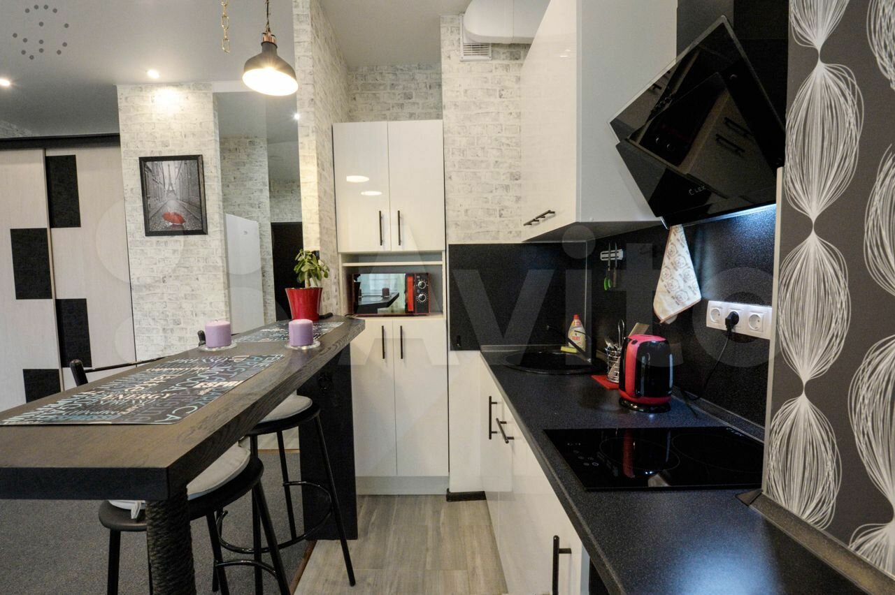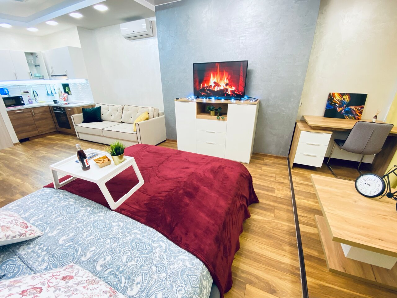 Все чистенько и уютненько. Есть все необходимое. Расположение замечательное. В доме есть разные кафе. Магазины в шаговой доступности. Мы заезжали на пару дней . Все было великолепно. Есть минибар. И можно заказывать еду. Заселение бесконтактное.