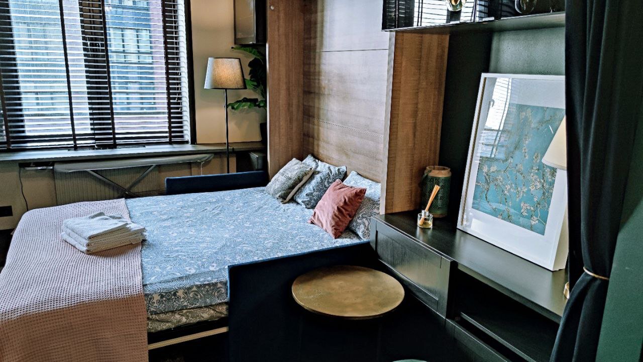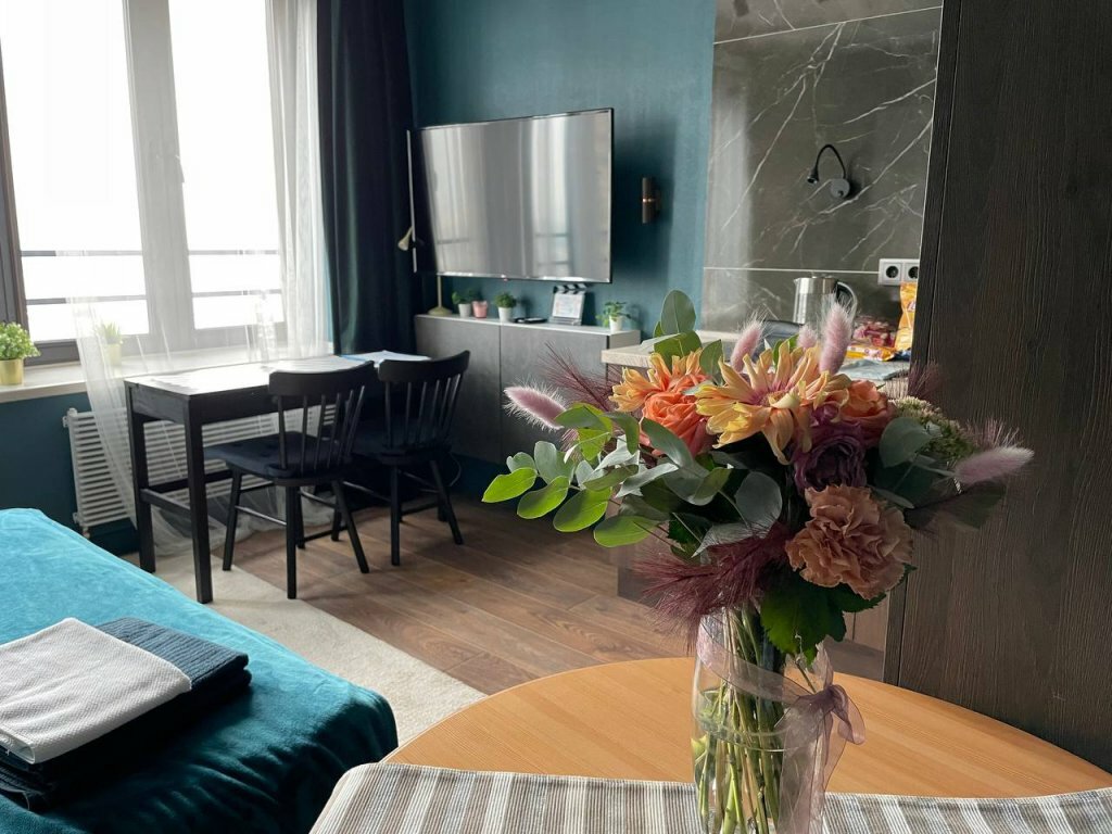 Квартира уютная,тихая.Расположение хорошее очень , много ресторанов и магазинов внизу дома,заезд быстрый и удобный очень.Менеджер всегда на связи. В апартаментах все удобства есть,смело можно брать больше суток Минусов не нашел