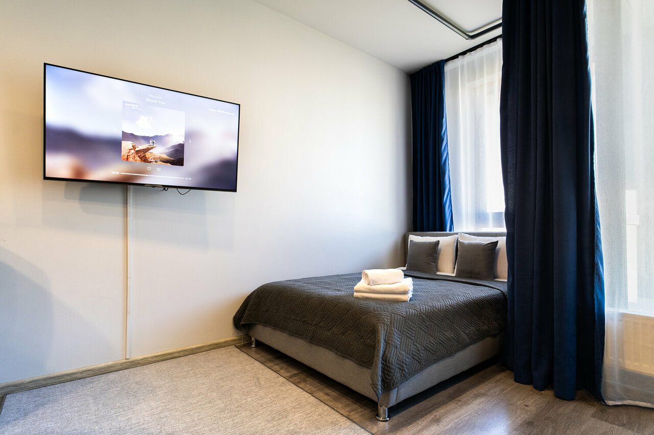 Апартаменты понравились. Удачное расположение, рядом парк, торговый центр, метро. Магазины и кафе в самом жилом комплексе. В номере все чисто — постельное белье, полотенца, сантехника, это важный пункт для комфортного проживания. Бесконтактный заезд /выезд удобно.