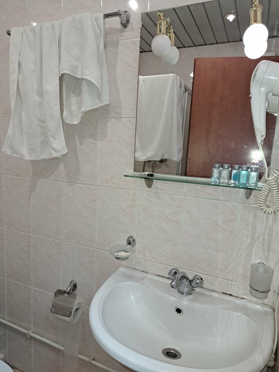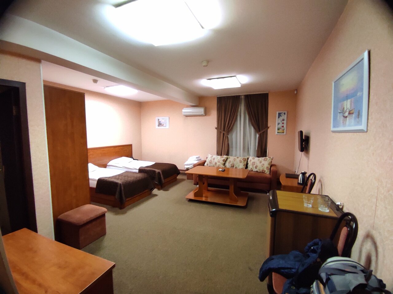 Прекрасный номер, чистый, просторный, белье белоснежное. Огромная плазма, чайник, холодильник. Отдельное спасибо персоналу за уборку , вежливость. Супер нам все понравилось. Кроме еды в кафе , вот тут проблема, не вкусно