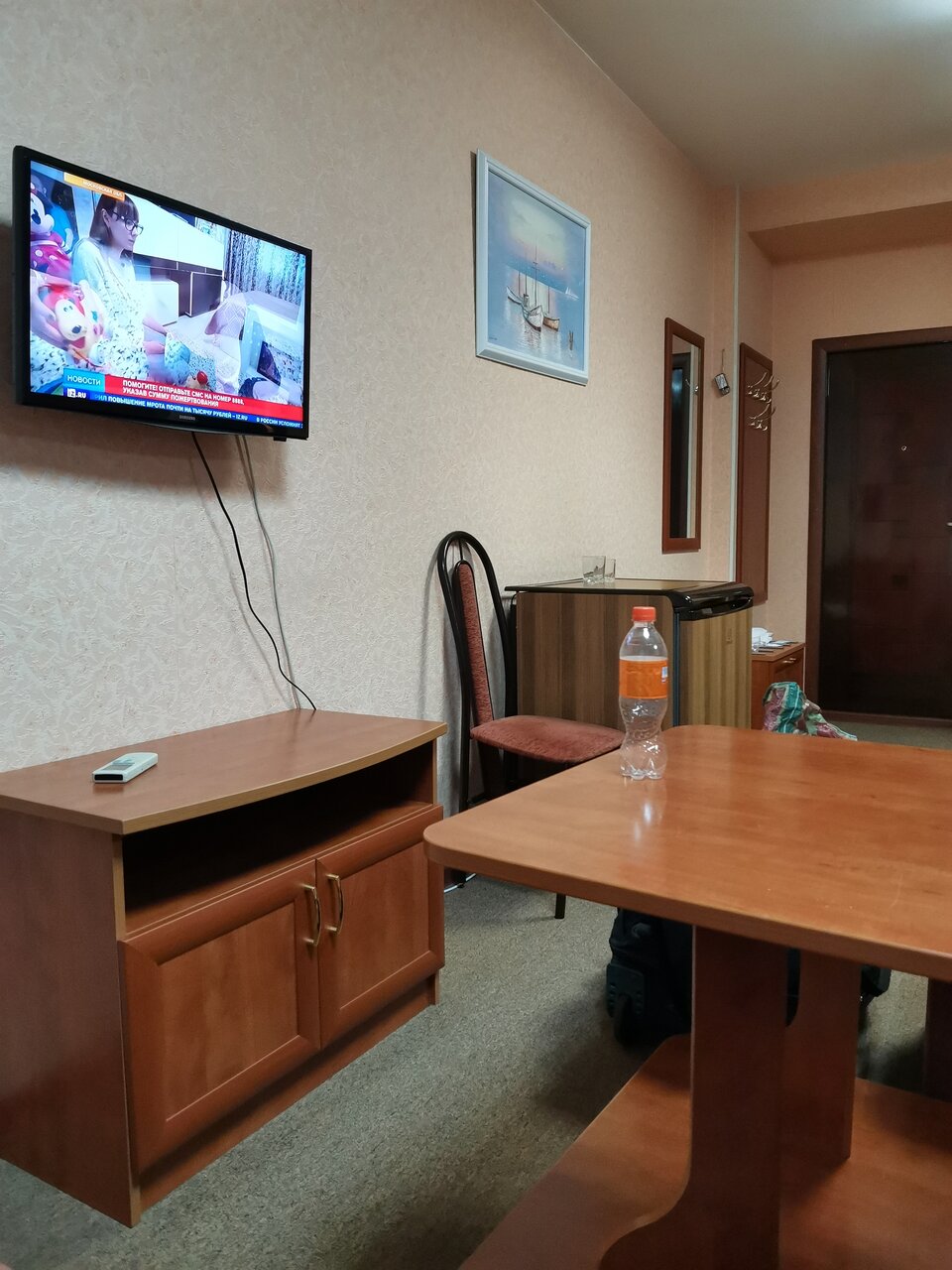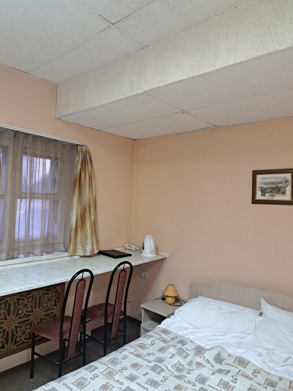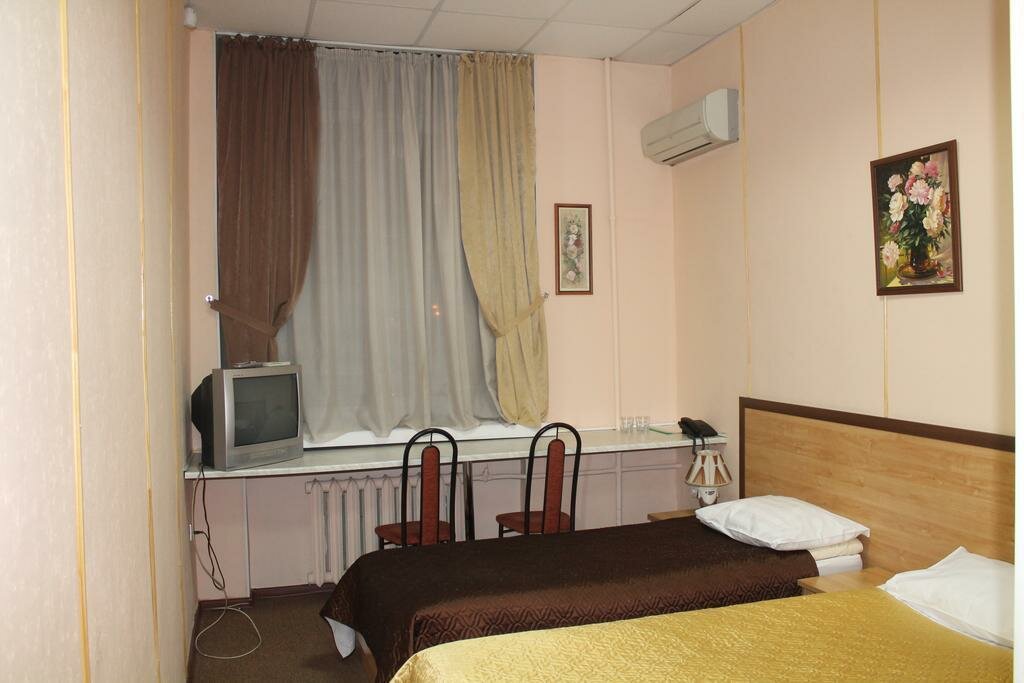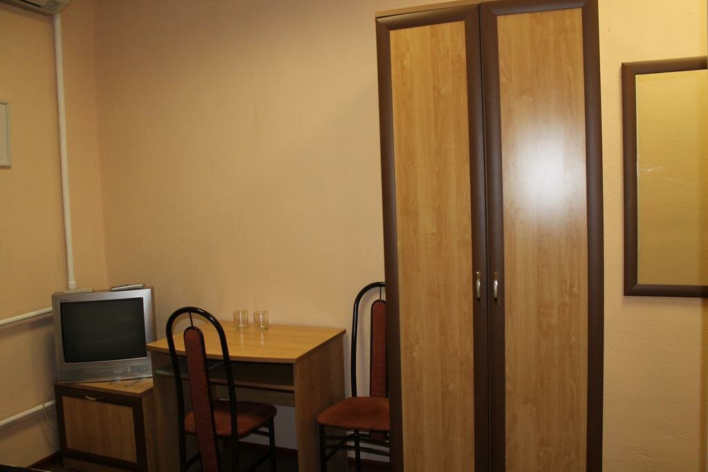 Хорошая недорогая гостиница. Удачное расположение. Номер чистый, матрас и подушки удобные, сантехника функционирует. Холодильник, телевизор, фен, шкаф с вешалками. В коридоре кулер с хорошей водой (без привкусов и запахов). На первом этаже кафе, где вкусно кормят. Каши получаются особенно вкусными. Руководство идет на встречу в дополнительных просьбах.