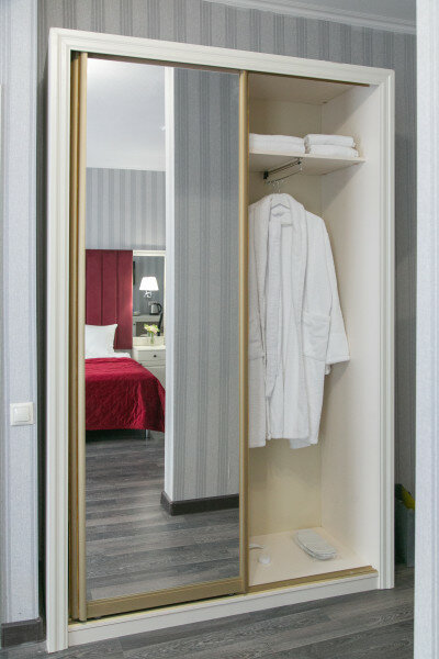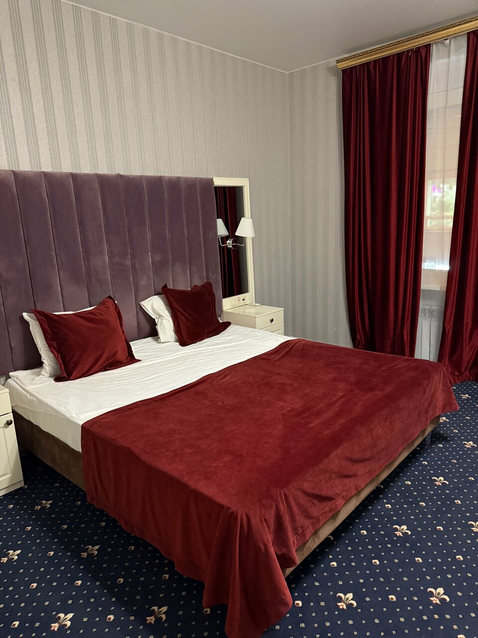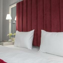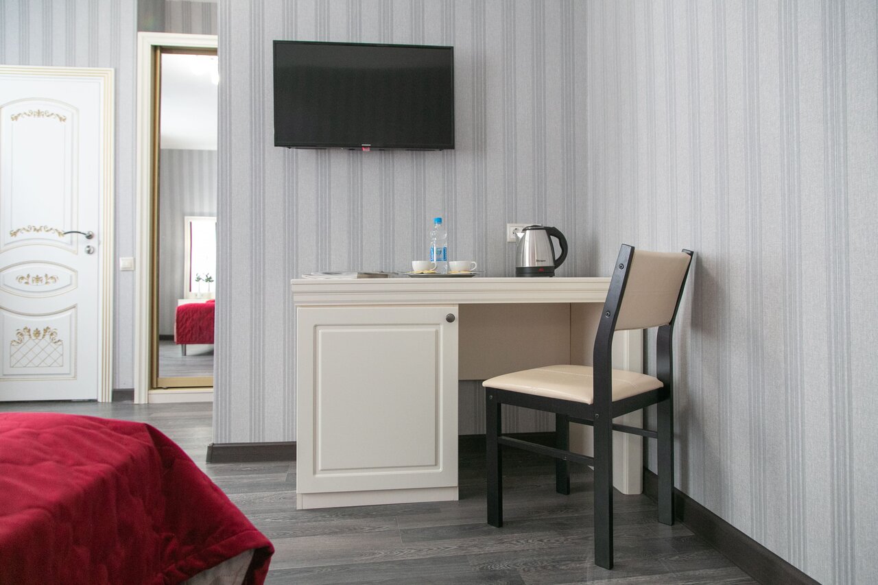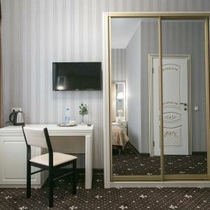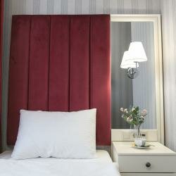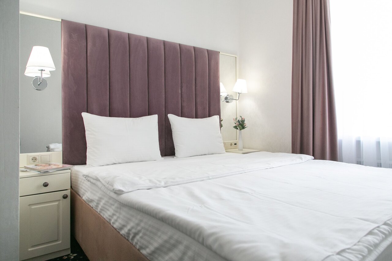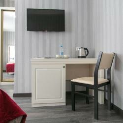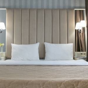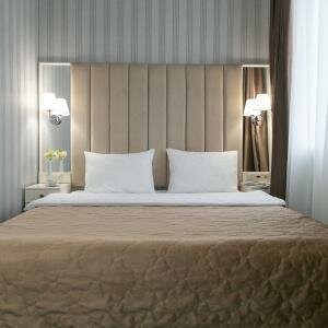 Улучшенный двухместный номер оснащен одной двуспальной кроватью размера king-size (180*200 см) и оборудован всем необходимым для комфортного проживания: телевизором, электрочайником, прикроватными бра, розетками, тумбочками, ортопедическим матрацем,