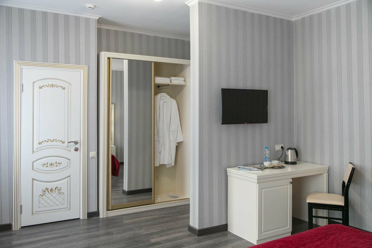 Двухместный номер Делюкс оснащен одной двуспальной кроватью размера king-size (200*200 см) и оборудован всем необходимым для комфортного проживания: телевизором, кондиционером, чайным набором, прикроватными бра, тумбочками, ортопедическим матраце...