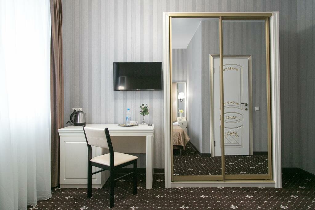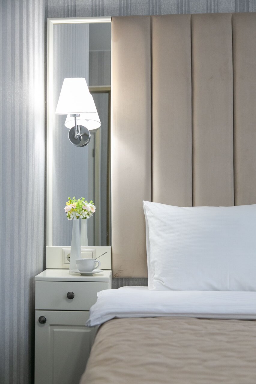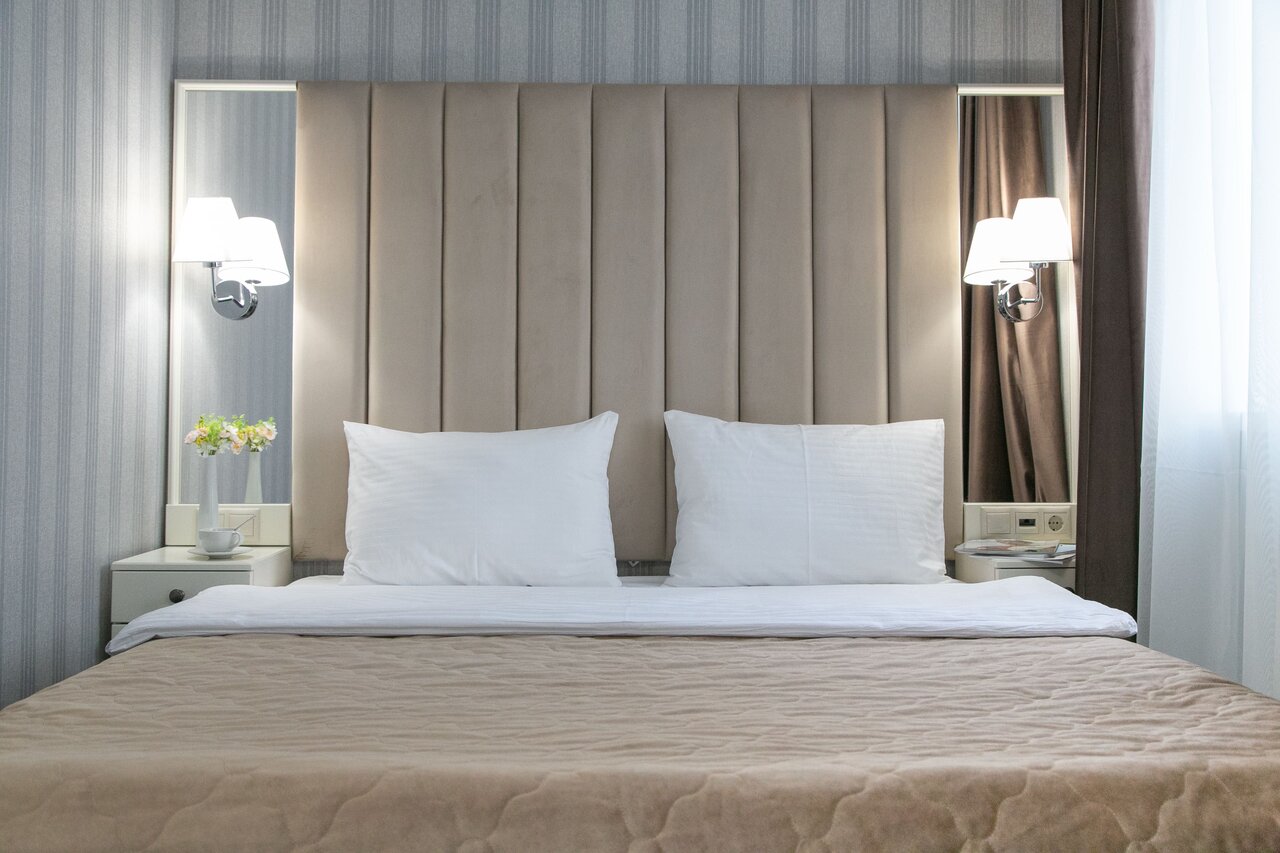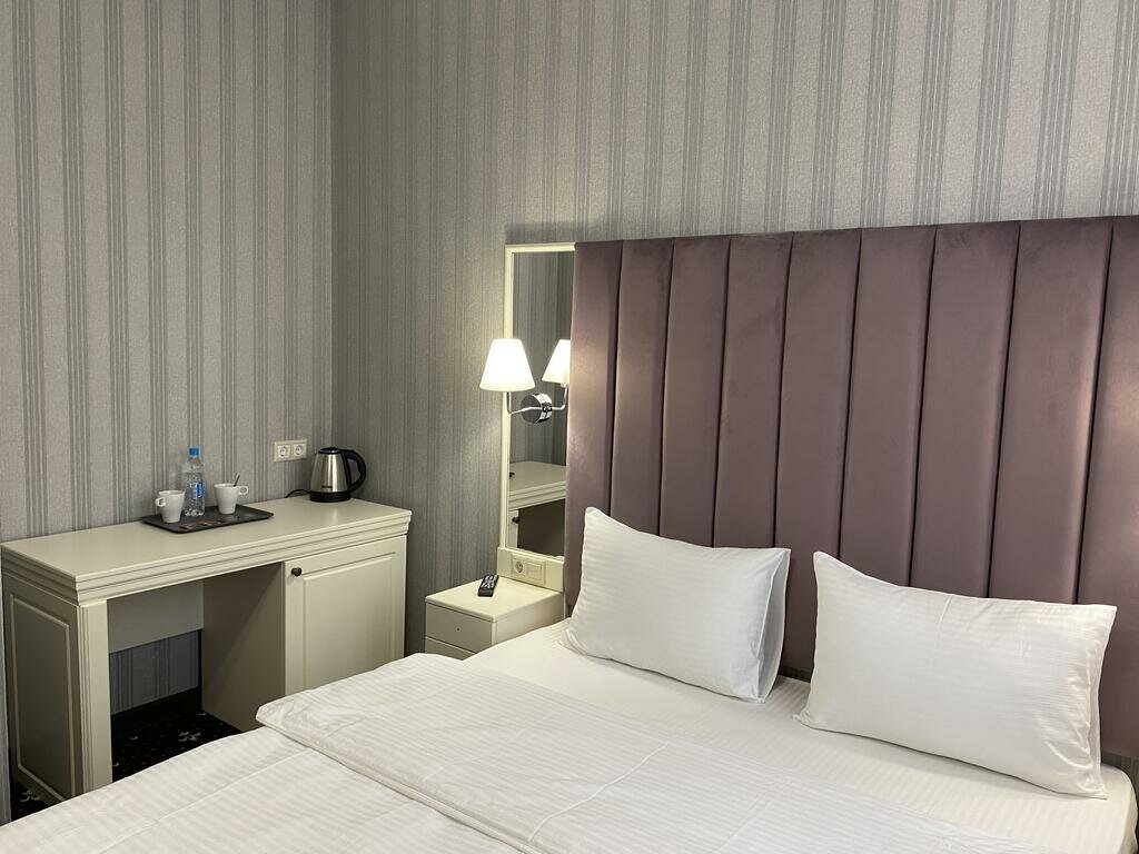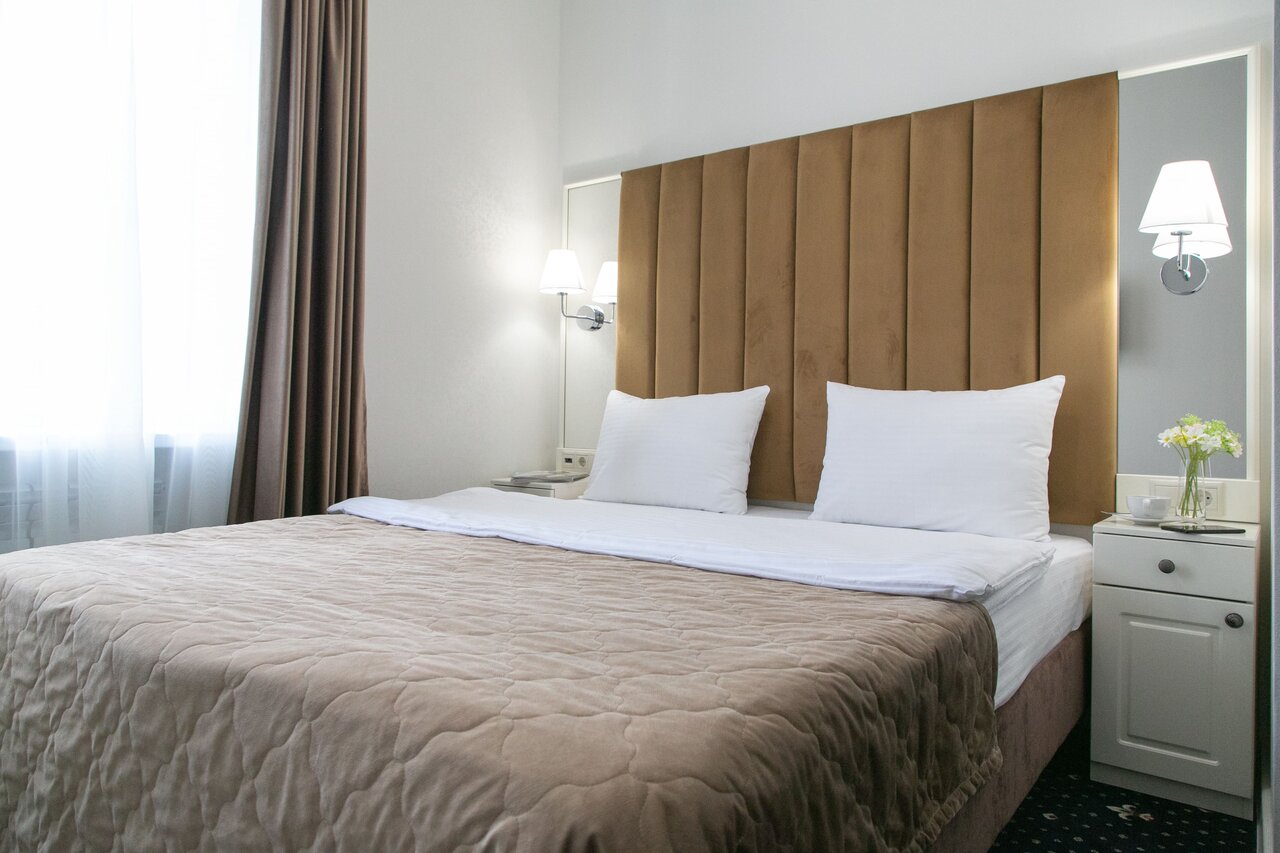 Стандартный двухместный номер оснащен одной двуспальной кроватью (160*200 см) и оборудован всем необходимым для комфортного проживания: телевизором, электрочайником, прикроватными бра, розетками, тумбочками, ортопедическим матрацем, который обеспечит