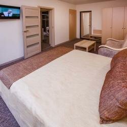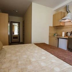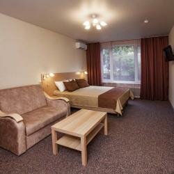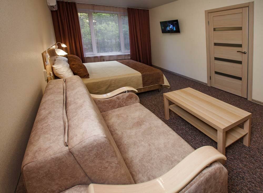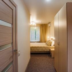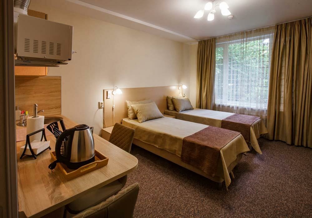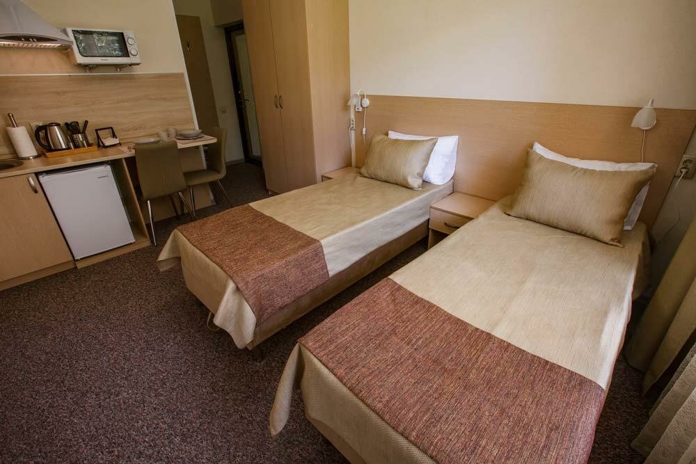 Номер класса Комфорт со всеми удобствами. Большая двуспальная кровать с возможностью разделения на две отдельные.Номер оборудован мини-кухней.WiFi, Телевизор, Кондиционер. Безопасность: в