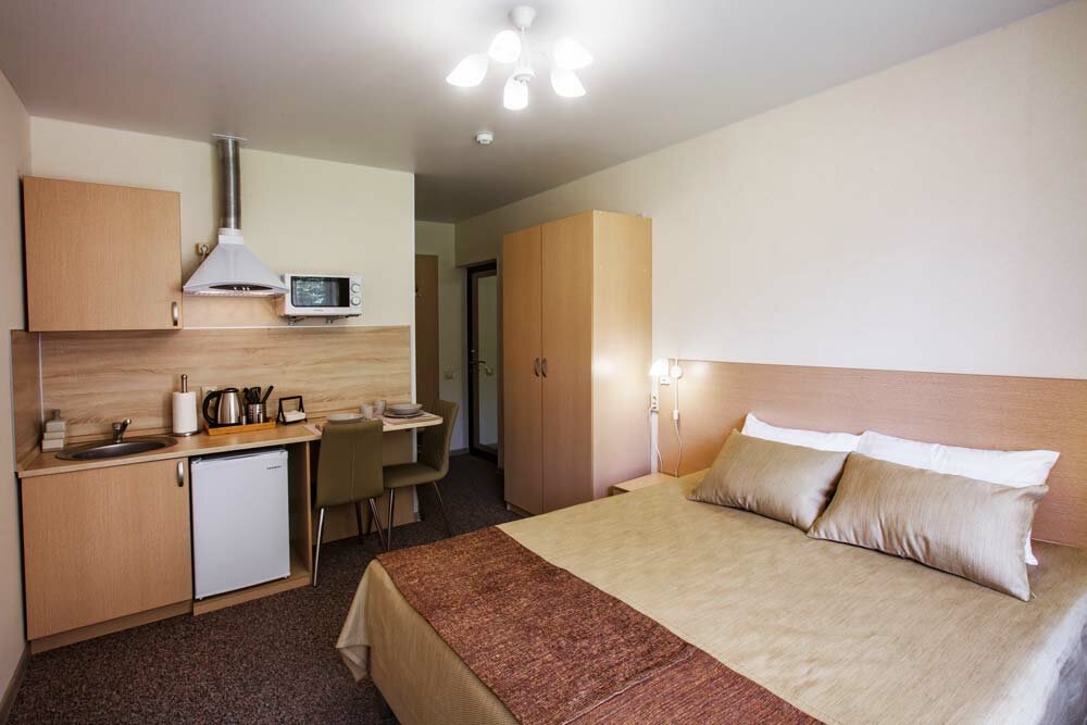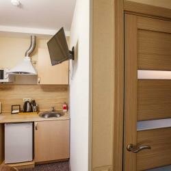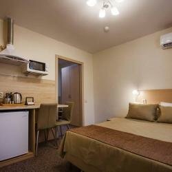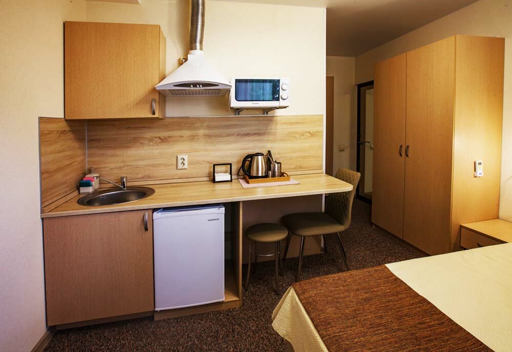 Комфортабельный номер для размещения 1-2х человек, с выделенной зоной мини-кухни, оснащенной бытовой техникой (Телевизор, кондиционер, стиральная машина, холодильник, чайник, СВЧ печь, светильники, стулья, стол, тумбы, шкаф для одежды, тумба для обув