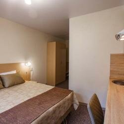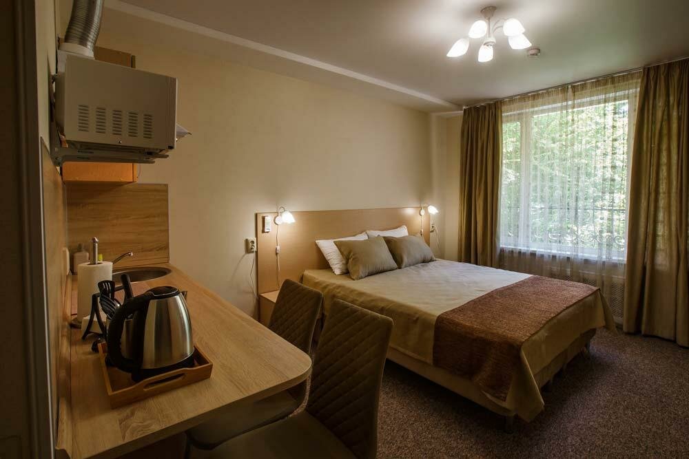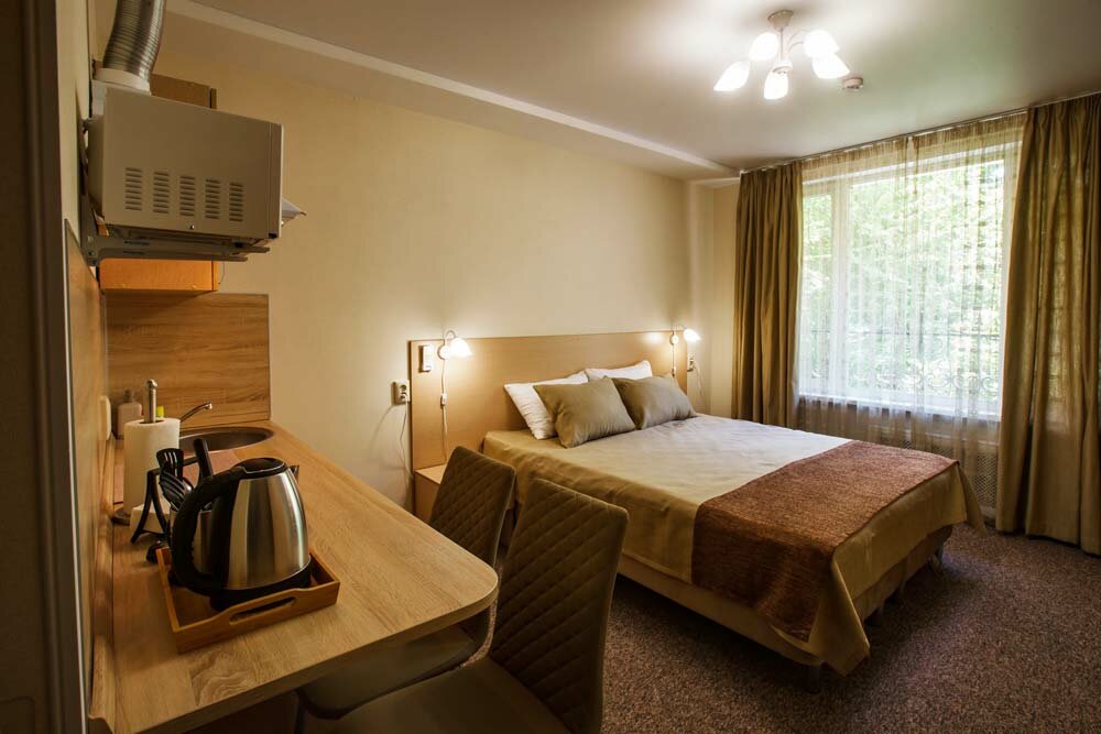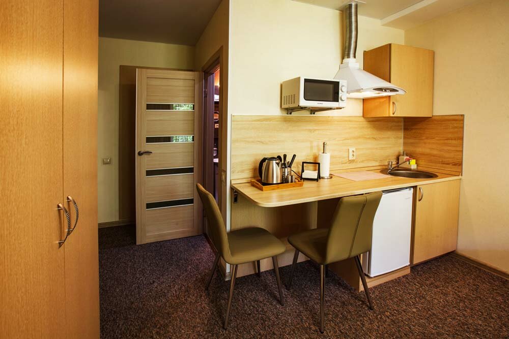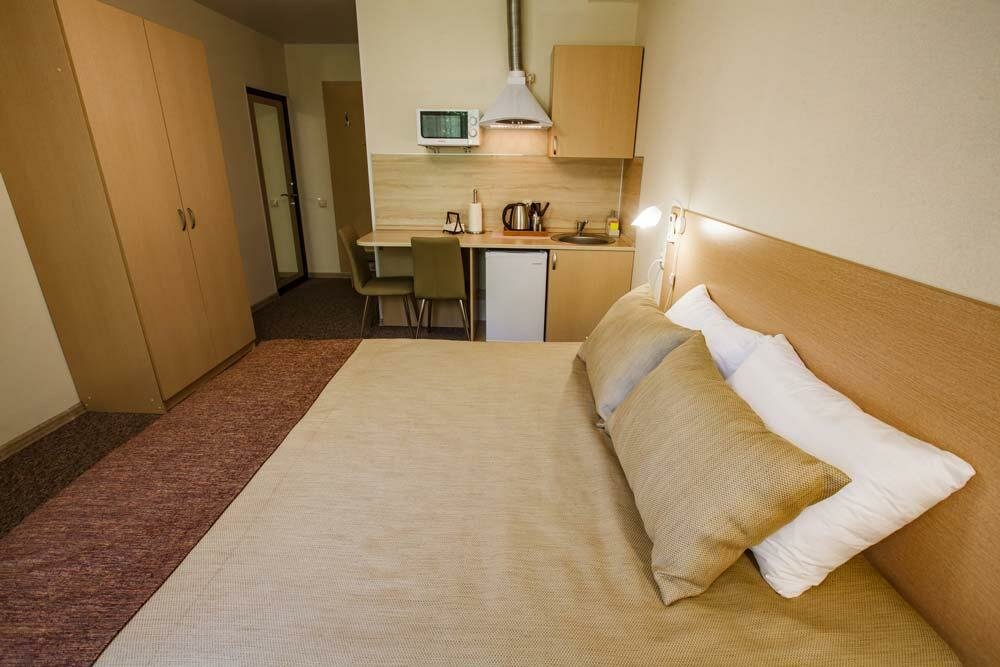 Номер Комфорт для размещения 1-2х человек, с выделенной зоной мини-кухни, оснащенной бытовой техникой (Телевизор, кондиционер, стиральная машина, холодильник, чайник, СВЧ печь, светильники, стулья, стол, тумбы, шкаф для одежды, тумба для обуви, фе...
