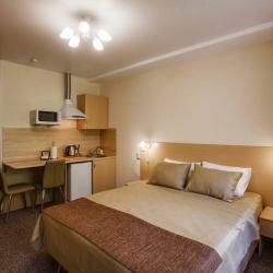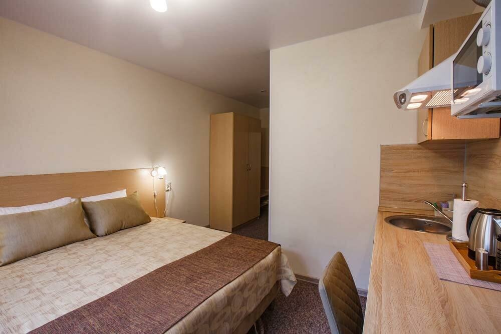 Комфортабельный номер в апартаментах для размещения 1-2х человек, с выделенной зоной мини-кухни, оснащенной бытовой техникой: Телевизор, высокоскоростной WiFi, кондиционер, стиральная машина, холодильник, чайник, СВЧ печь, светильники, стулья, стол,