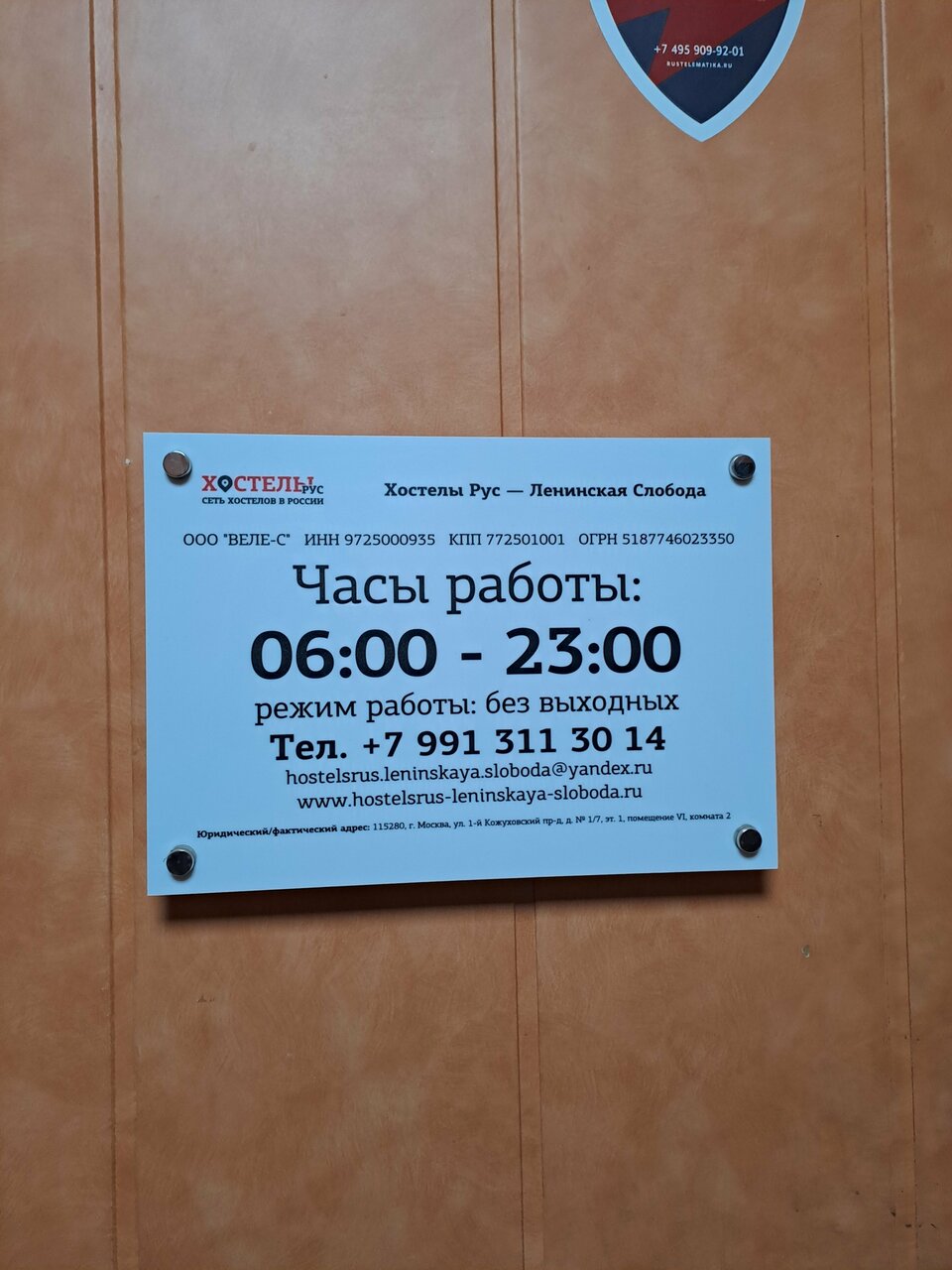 Контакты: — Телефон: +7 (991) 311-30-14 (бронирование). — Сайт: hostelsrus-leninskaya-sloboda.ru. — Работает ежедневно с 06:00 до 23:00.