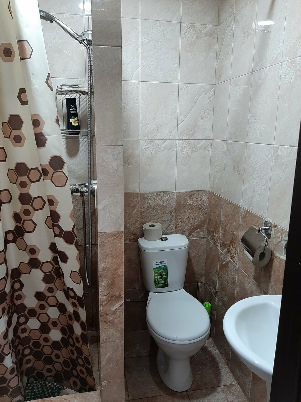 - Гардина в душевой перевязана скотчем.