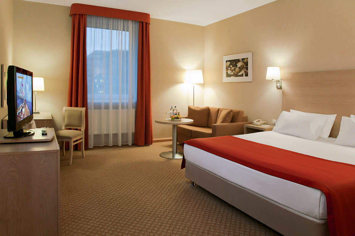 Номер с двуспальной кроватью и раскладывающимся диваном, оборудован всем необходимым для комфортного отдыха. К вашим услугам кондиционер, набор для приготовления чая и кофе, гладильная доска и утюг, сейф, мини-бар, ванная комната. Доступ к Wi-Fi.
