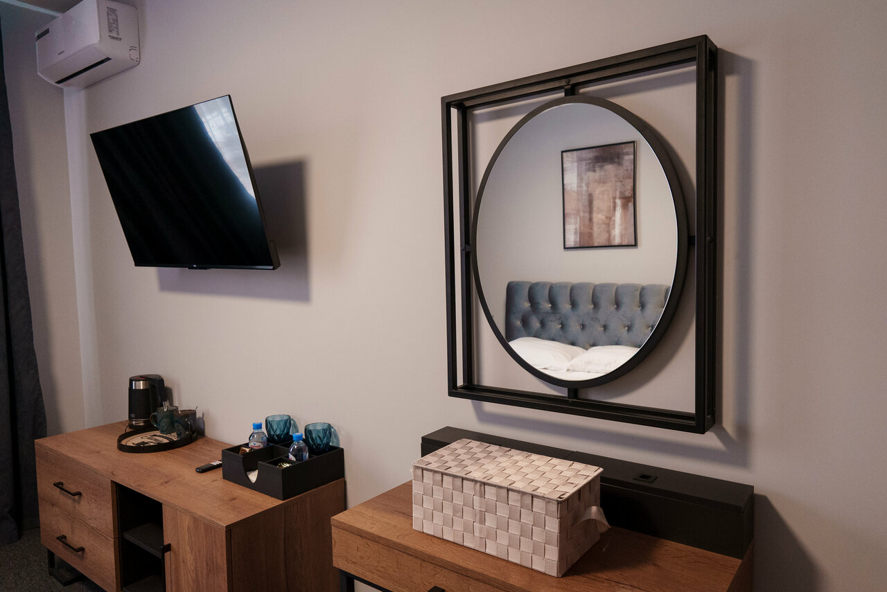 Отличный отель, уютно, администратор всегда вежлив и готов помочь. Хороший ремонт, удобное расположение. В номере есть всё: кровать, столы, пуфики, зеркала, душевая кабинка, туалет, тапочки, халат, полотенца, кондиционер, носки, тумбочки, чайник, кружки, ложки, чай, телевизор, есть приятный комнатный ароматизатор.