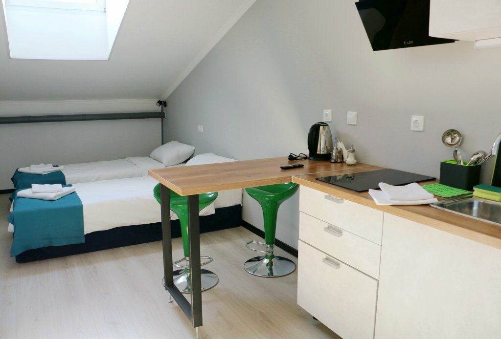Предлагаем вам прекрасные двухуровневые апартаменты площадью 16 м², рассчитанные на 3 человека (1+1+1): две BoxSpring кровати (по умолчанию надёжно скреплены в одну двуспальную) и раскладная кровать. Забронируйте прямо сейчас и проведите незаб