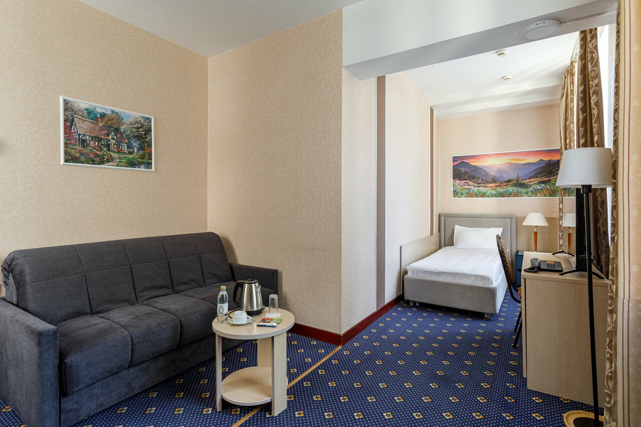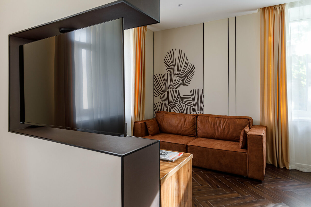 Площадь номера 32 кв мВ номере:мини-холодильникбутилированная водачайная станциякофе-машинабагажная тумбазона гостиной и рабочий столспальная зонаполный набор банных и косметических принадлежностейфенкосметическое зеркалоТВ, благодаря ...