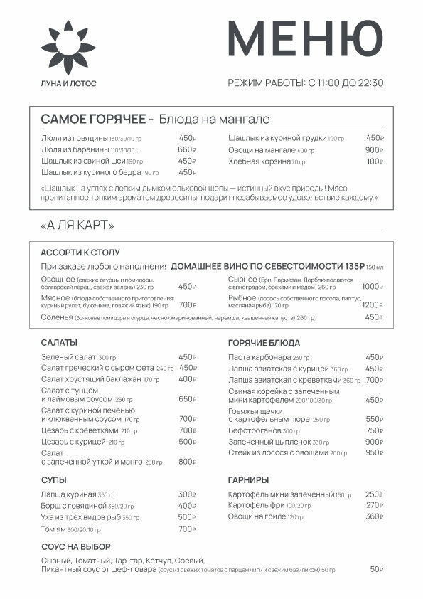 Ресторан отеля «Луна и Лотос» подходит как для деловых встреч, так и для отдыха.Меню ресторана представлено блюдами Европейской и Азиатской кухни, а также блюдами на Мангале.