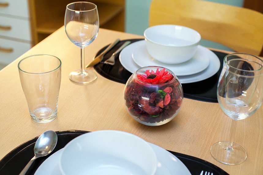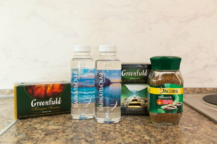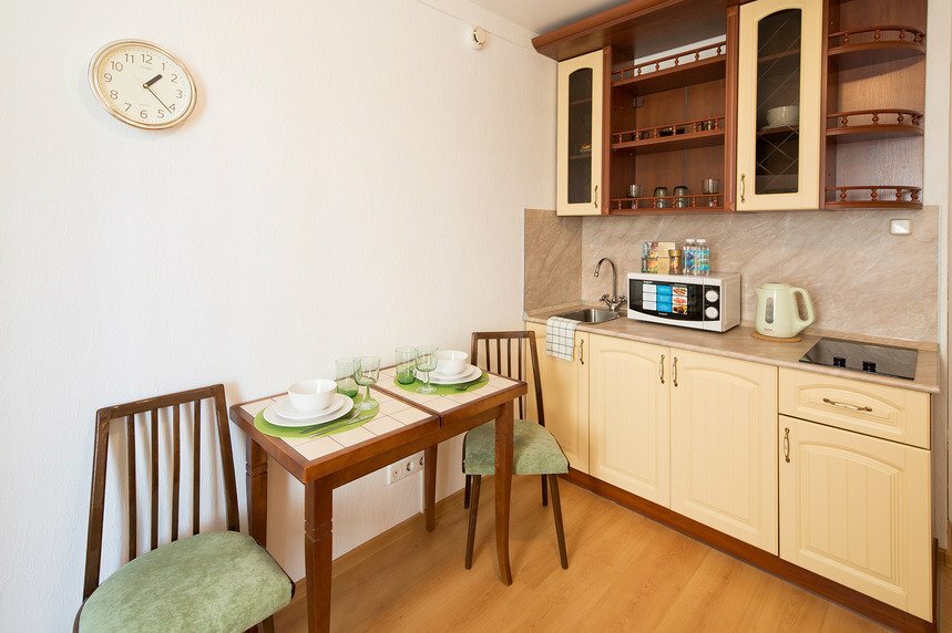 - Вздутая кухонная столешница, недостаток посуды (одна вилка).
