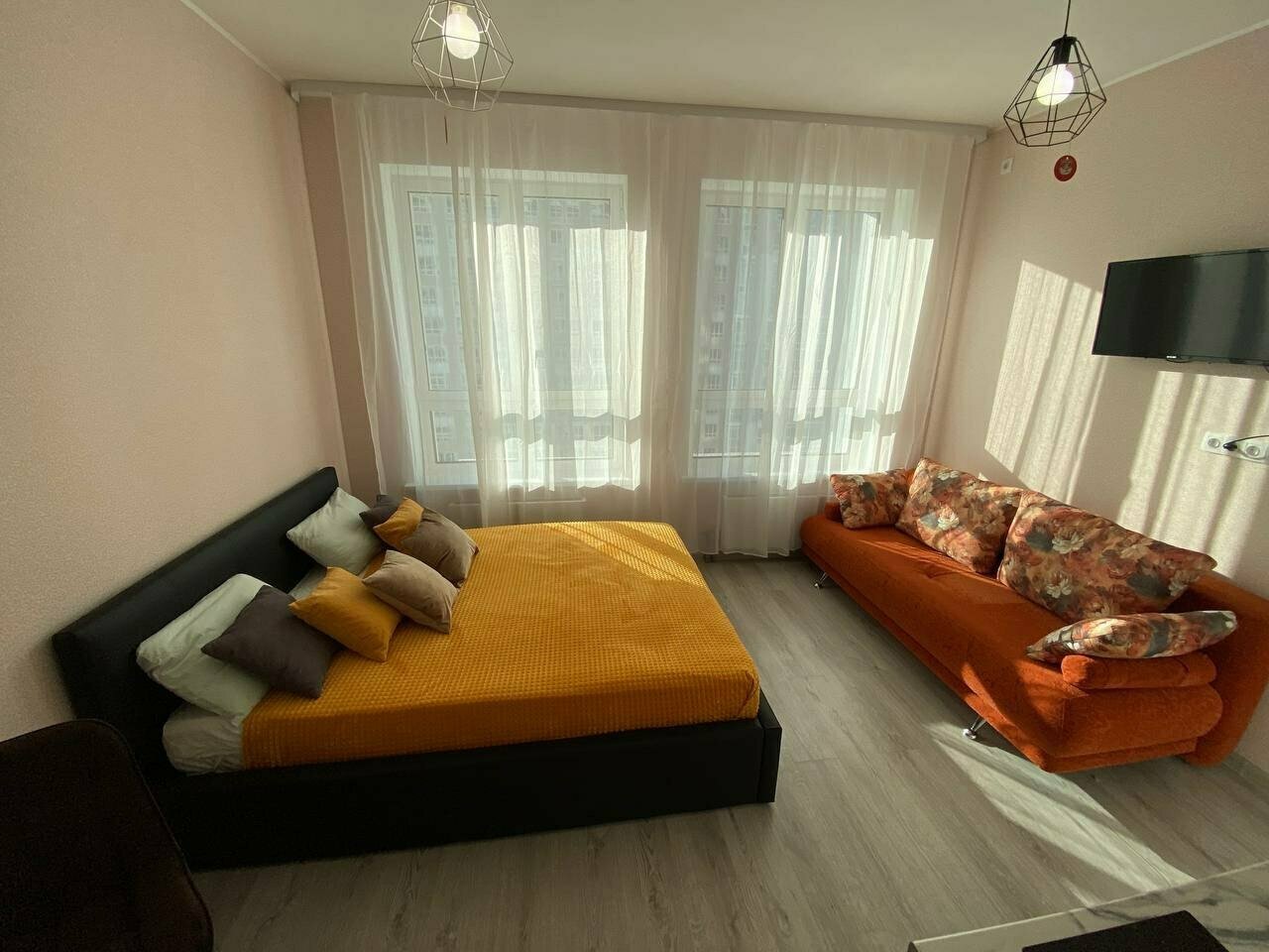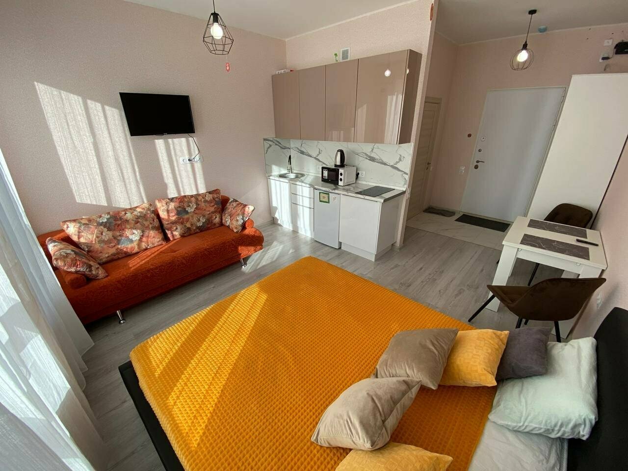 Просторные апартаменты, где каждому будет удобно.Кухня-гостиная: Кухонная рабочая зона, варочная поверхность, холодильник, СВ печь, посуда, сплит-система, ТВ, обеденная группа, диван-кровать.Спальня: двуспальная кровать, журнальный столик, торшер