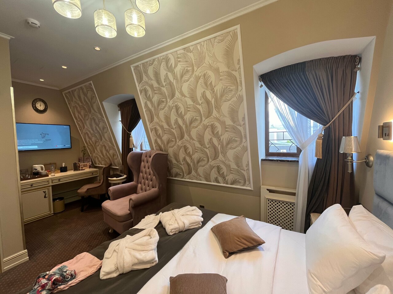 Уютный комфортный и очень красивый номер. Свежие полотенца, всё необходимое в номере, включая фен, гладильную доску и нитки с иголкой, отличный сервис и вкусные завтраки! Рекомендую однозначно эту гостиницу