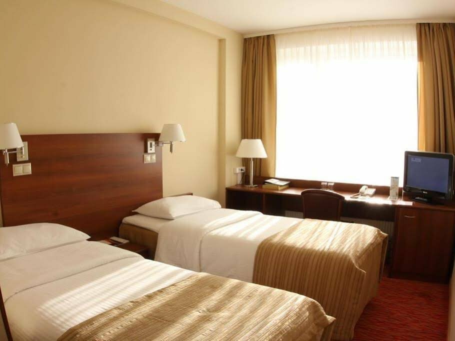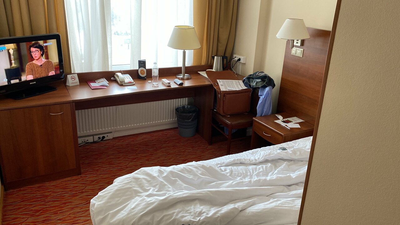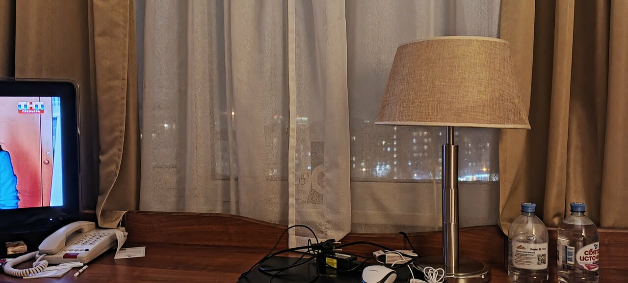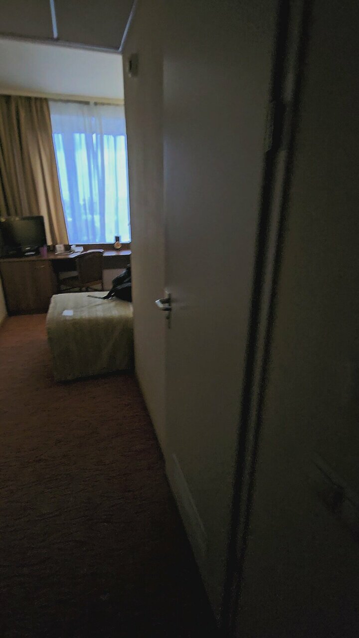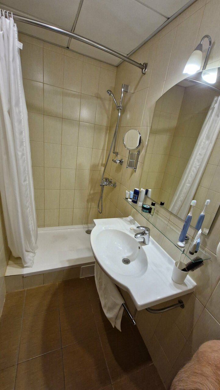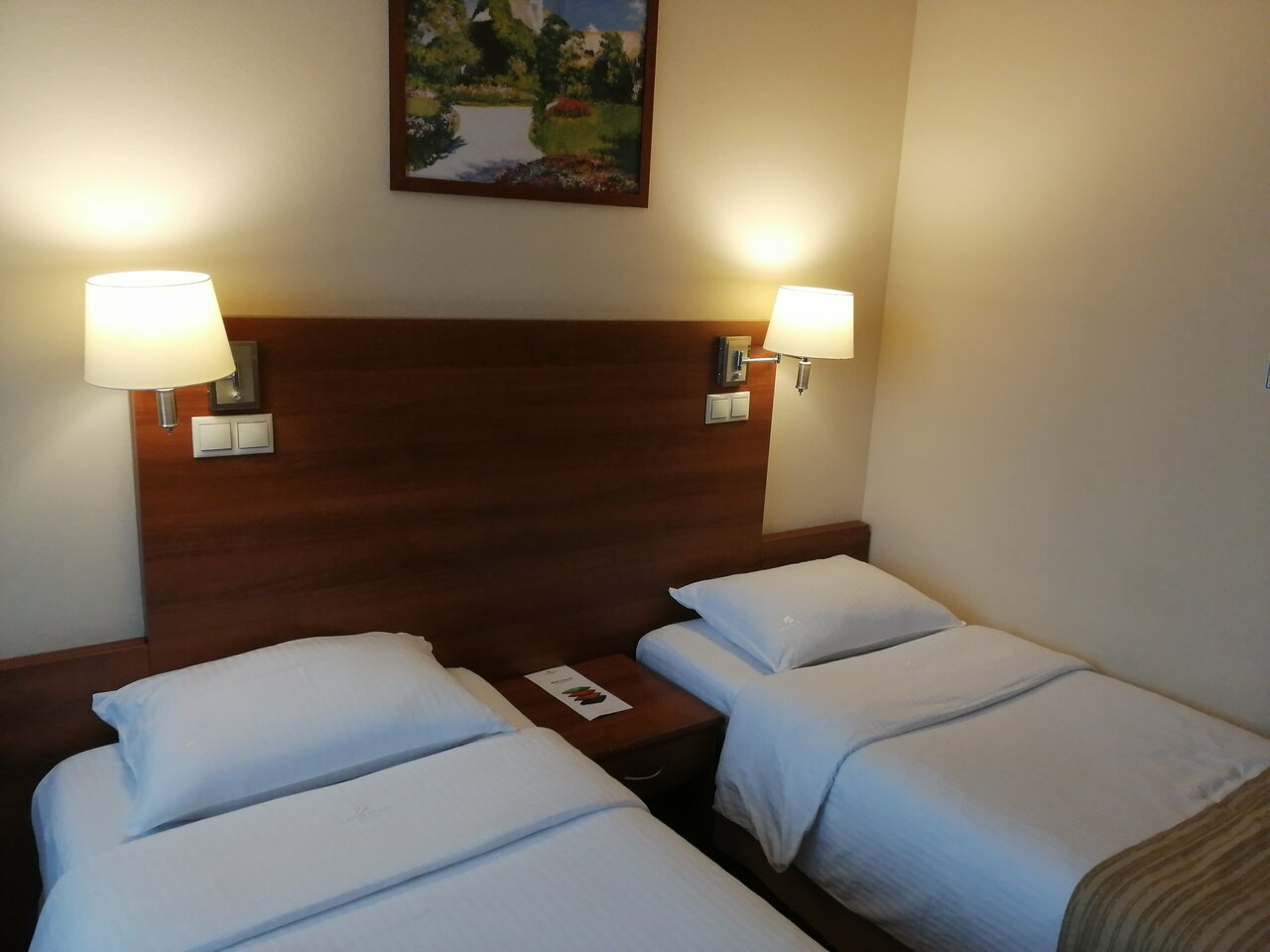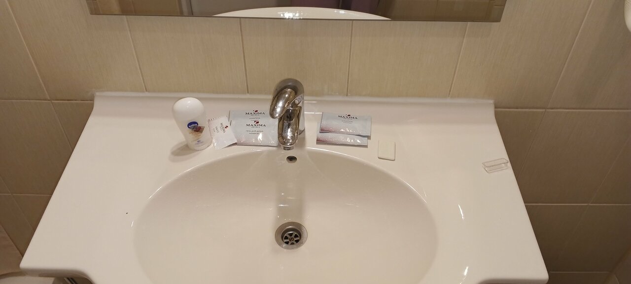 Гостиница расположена рядом с метро. Большой . Но есть и минусы. Заказывал одну большую кровать. Подпихнули две обьедененные вместе. Между них проваливаешься. В душевой слив забит. Вода очень медленно уходит. Приходиться выключать воду. В номере был чайник, холодильник. На столе 2 бутылки воды, чай и кофе в пакетиках. В ванной комнате находились гель и шампунь. Телевизор ушатанный но смотреть можно. Белье чистое.