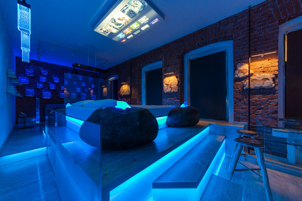 Интерьер с кроватью, выполненной из гранитных валунов, отсылает к древним мегалитическим постройкам из каменных глыб, но с неожиданного ракурса: сочетание грубой фактуры камня с высокотехнологичными решениями – от смарт-стекла до светильников с магич