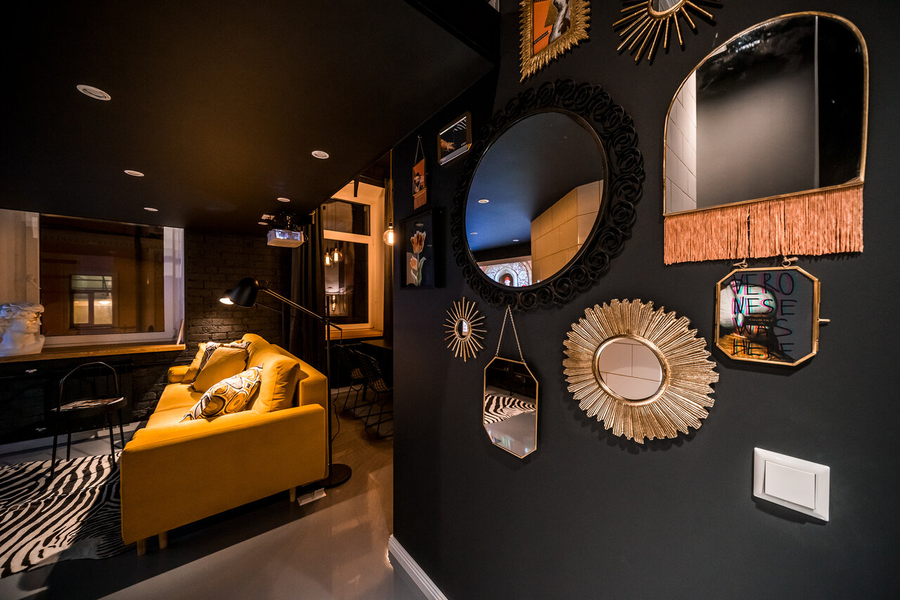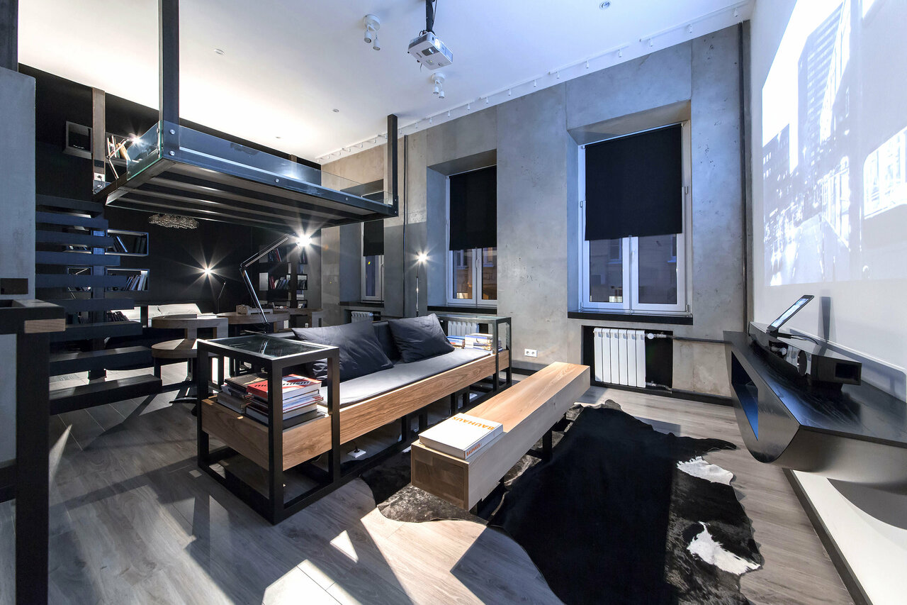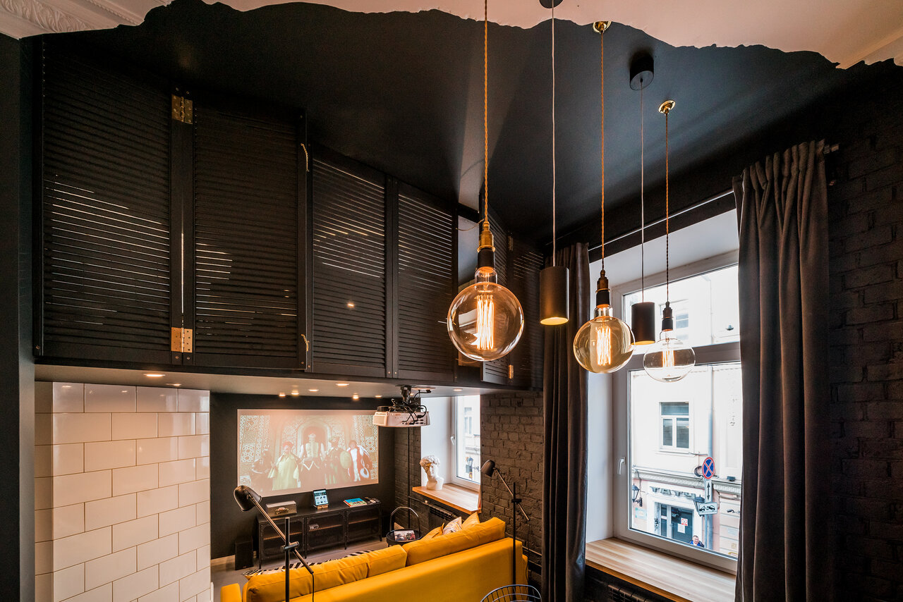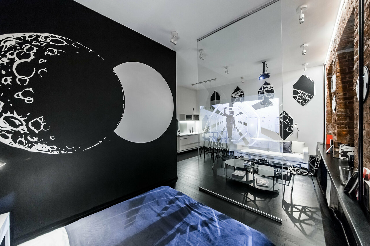 Студия Мельникова, названная так в честь гениального архитектора Константина Мельникова – студия-комикс, интерьерная версия рассказа об удивительном космическом путешествии! Здесь есть все атрибуты будущего – лунный пейзаж за окном, бесконечный зерка