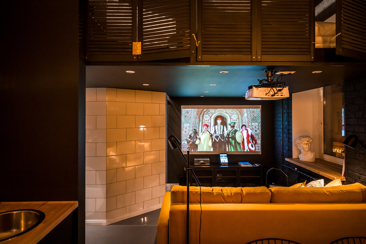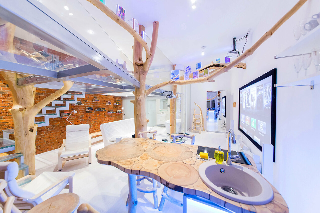 Сосновая студия удивляет настоящими соснами, привезенными из-под Новгорода и установленными прямо внутри интерьера. Здесь между трех раскидистых крон расположился уютный дом на дереве со своей эко-системой: отдельным кинотеатром, игровой консолью, би