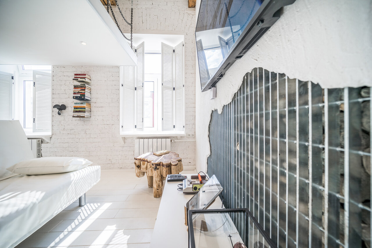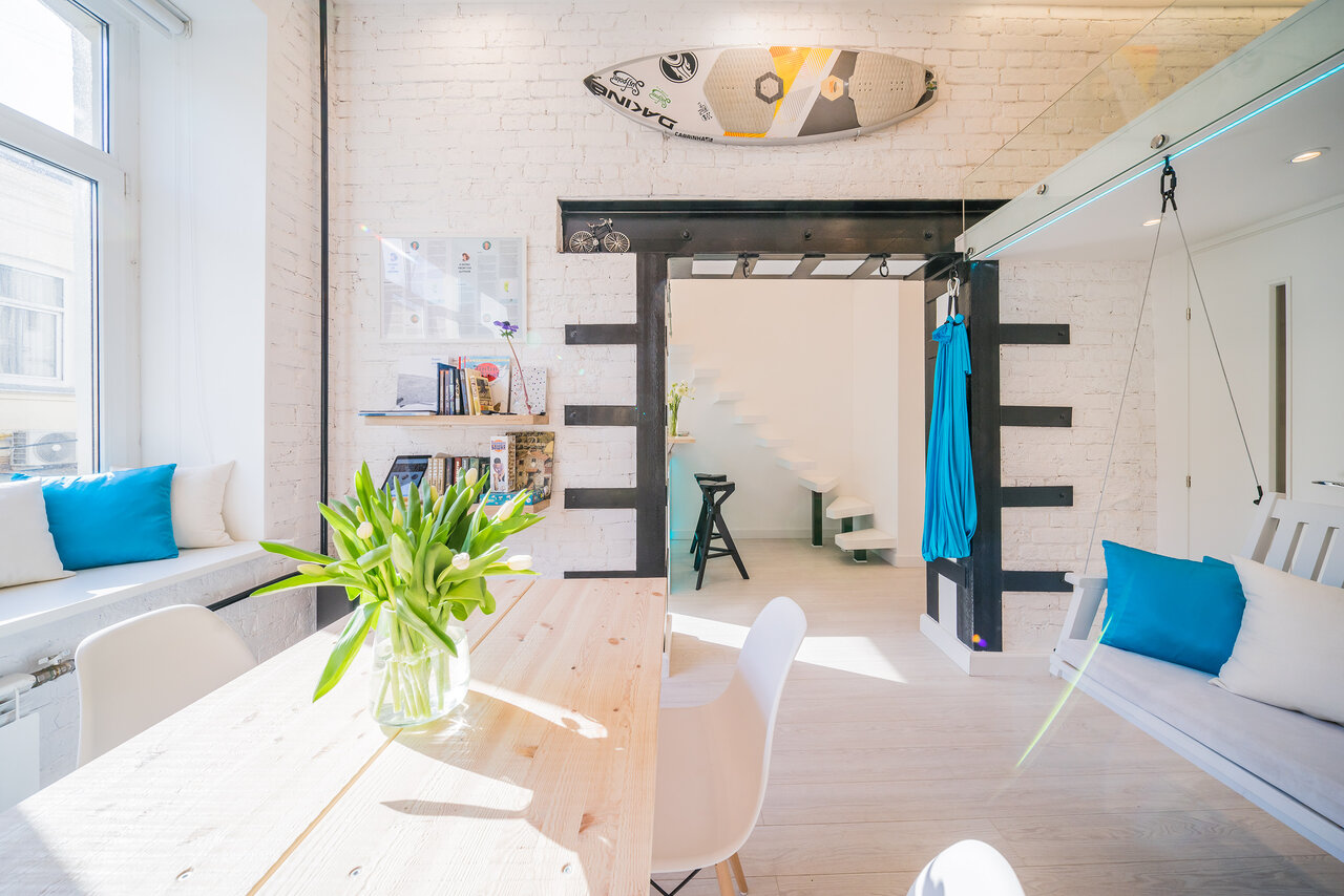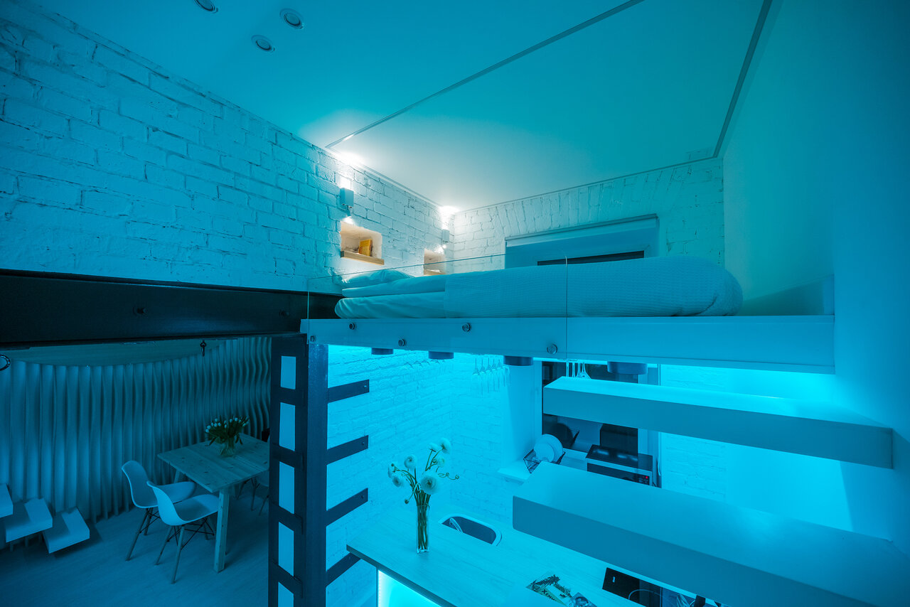 Студия Баланс — это чистое белое пространство, залитое густым голубым неоновым светом и разделённое на две зоны. Наверху расположены спальные места. Оттуда, с высоты, можно наблюдать за тем, кто уже проснулся или подтрунивать над тем, кто ещё не ложи