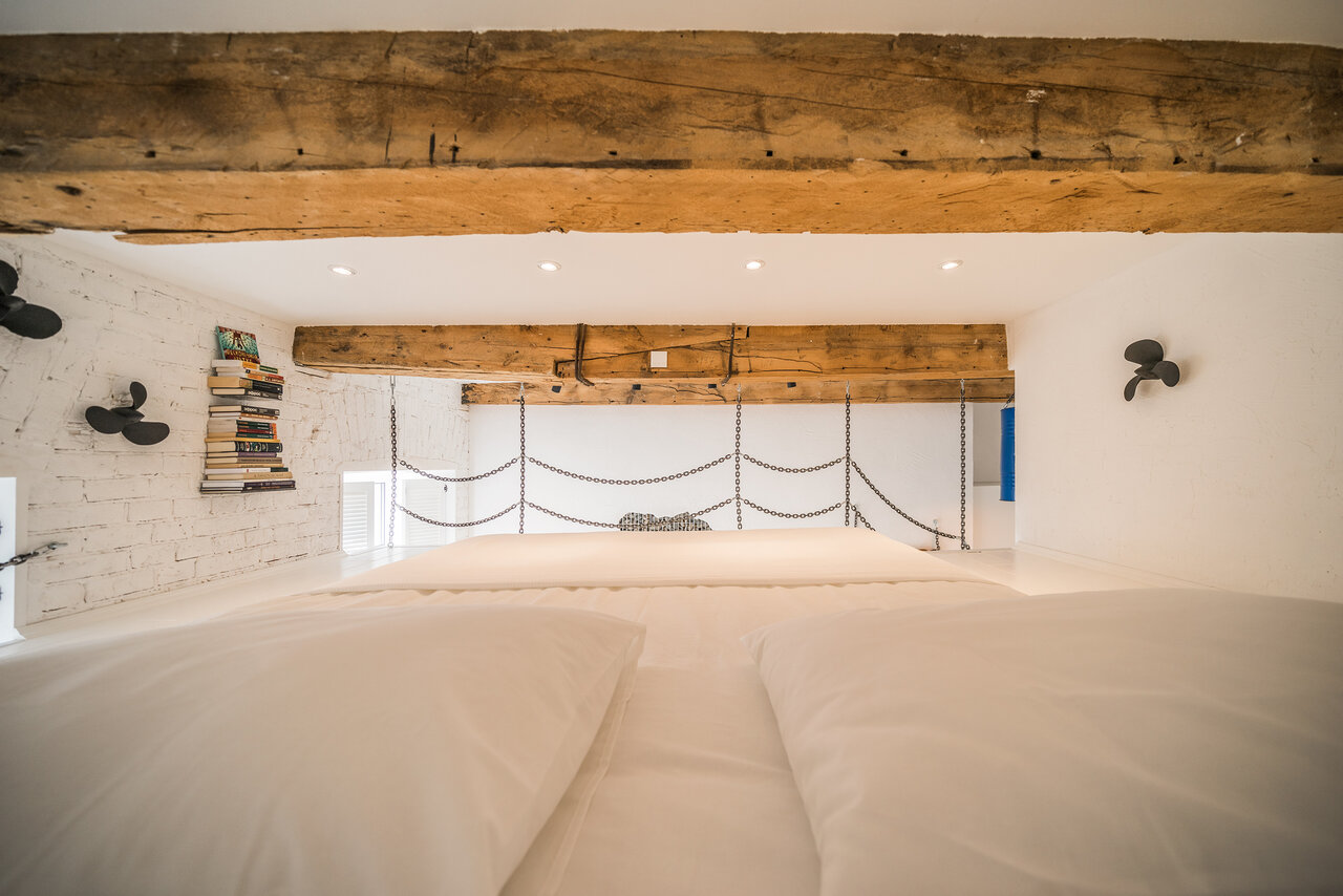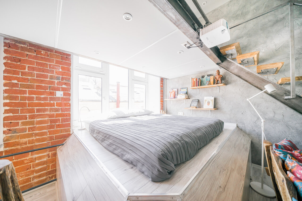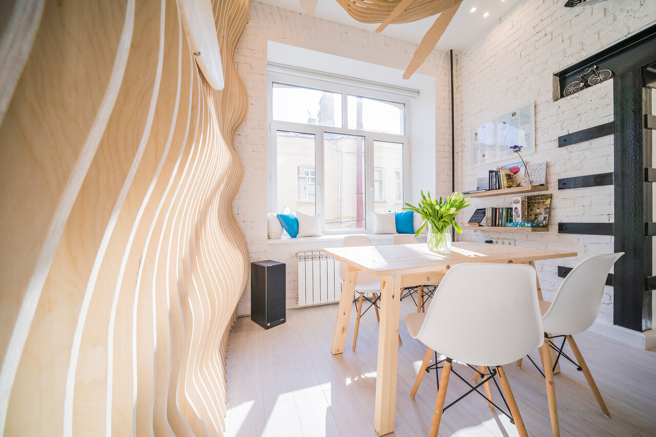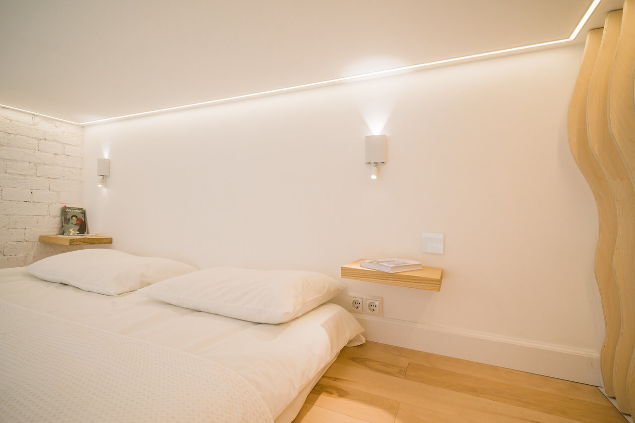 Студия Баланс — это чистое белое пространство, залитое густым голубым неоновым светом и разделённое на две зоны. Наверху расположены спальные места. Оттуда, с высоты, можно наблюдать за тем, кто уже проснулся или подтрунивать над тем, кто ещё не ложи