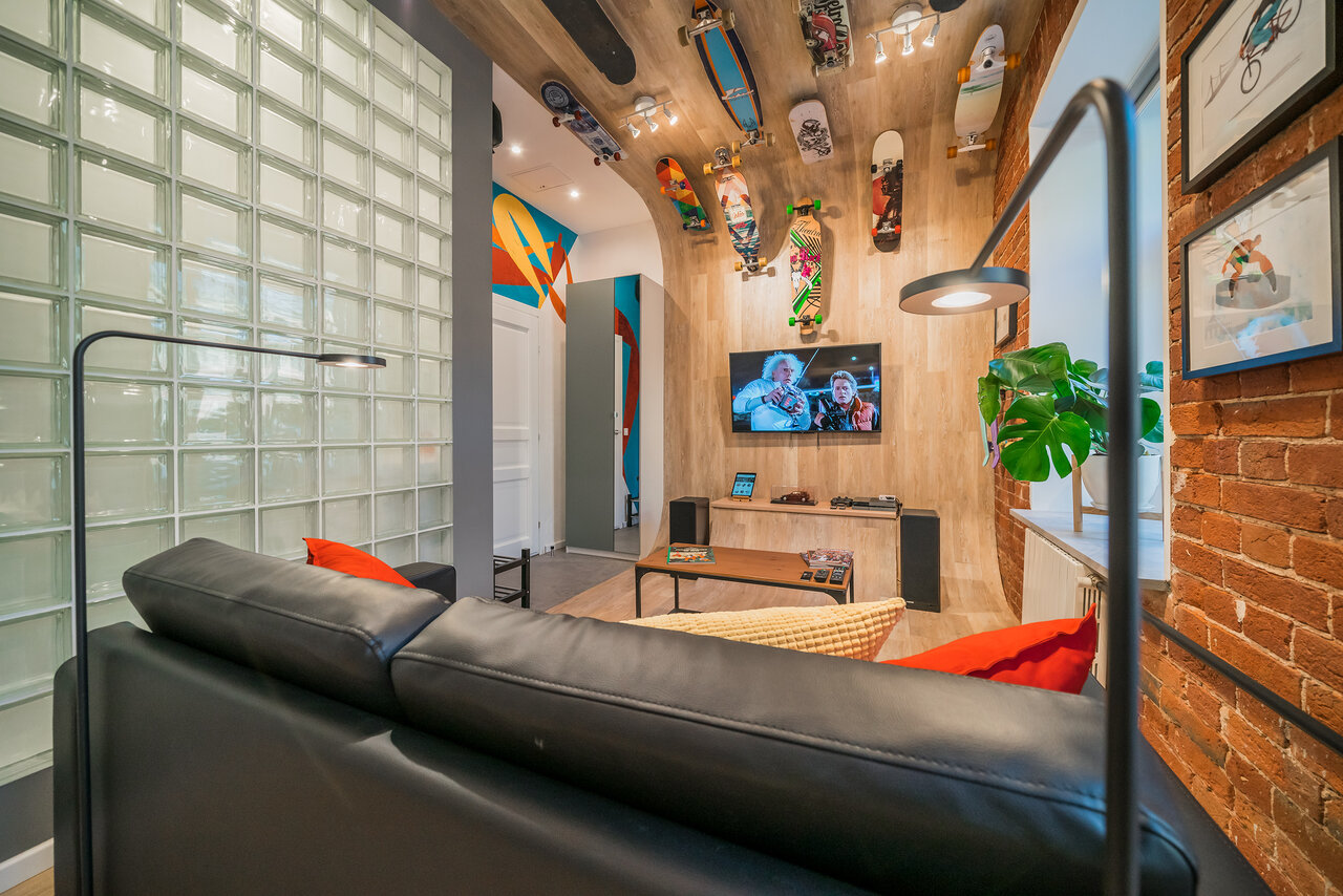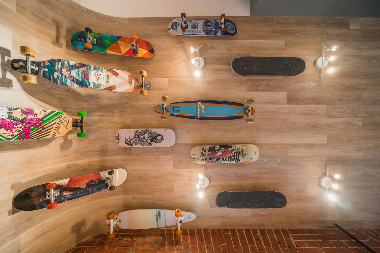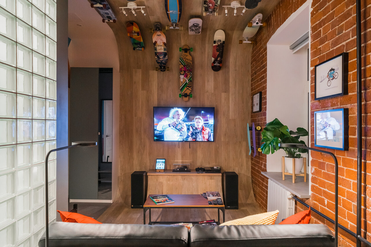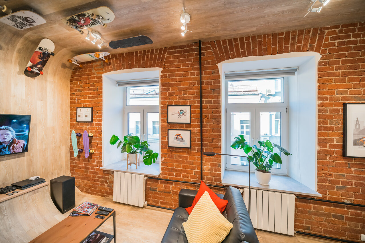 Интерьер «Экстрима» встречает гостей необычной скейтерской рампой, завернутой в кольцо прямо по стенам и потолку. Скейты, лонгборды, велосипед, путешествующие по этой бесконечной рампе — вся инсталляция как бы подсказывает, чем нужно заняться, оказав